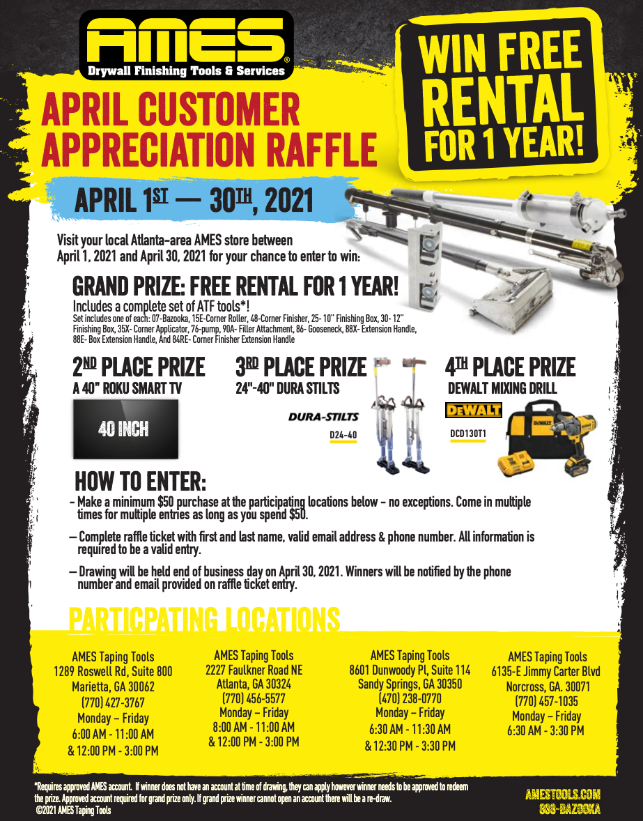 AMES Taping Tools is the nation’s leading provider of automatic taping and finishing (ATF) tools, supplies, and training to the professional drywall finishing industry. Our tool rental philosophy is simple; rent the tools and equipment you need for as long as you need. Our tools are always fully calibrated and ready-to-use, minimizing your jobsite downtime. We offer rental programs of all sizes to help you maximize productivity and manage costs.