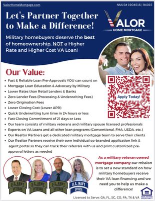 Valor Home Mortgage is a local digital online mortgage company founded and led by Military Veterans and Military Spouses. The company takes great pride in placing special emphasis on serving and protecting fellow Military and Veteran families to ensure they receive the best VA Loan product and services earned. Valor Home Mortgage's Elite Team of Mortgage Professionals are VA Loan experts, offering clients customized quotes, low rates, zero lender fees, superior service, and fast closings. The company is committed to supporting Equal Housing Opportunity and is licensed in Colorado, Georgia, Florida, South Carolina, and Pennsylvania. Clients have praised Valor Home Mortgage for its exceptional service, especially for veterans. The company's dedication to assisting clients throughout the home-buying process is commendable, with prompt responses, thorough explanations, and a focus on finding the best solutions. Customers have consistently expressed their satisfaction with the company's expertise, professionalism, and commitment to ensuring a smooth and enjoyable home-buying experience, particularly for first-time buyers and veterans.