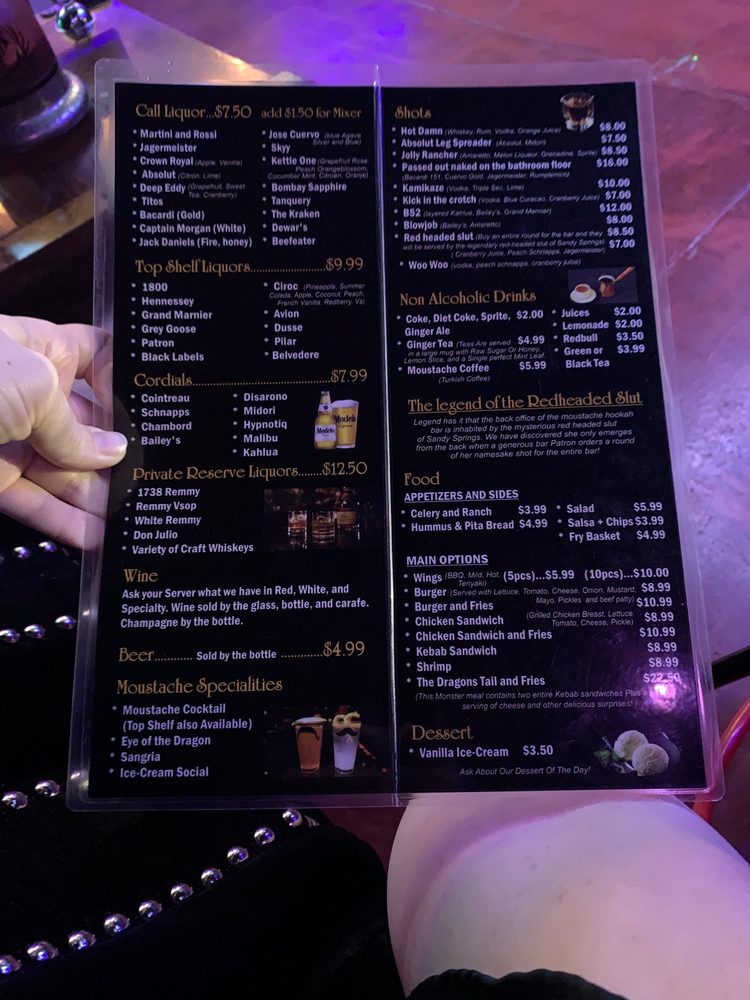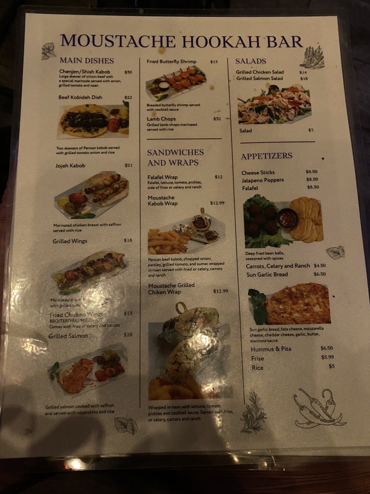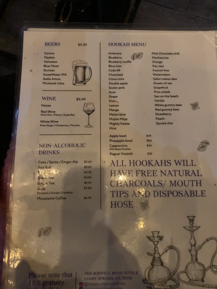 Moustache Hookah Bar, located at 7855 Roswell Rd, Unit B, offers a unique blend of Persian cuisine and a relaxing hookah lounge experience. The restaurant features an inviting atmosphere with attention to detail in its design, creating a cozy and stylish setting perfect for gatherings. Guests can enjoy a variety of authentic Persian dishes made from fresh ingredients, along with a selection of drinks that are highly praised for their quality. The hookah menu is extensive, with options like milk base, water base, and cold tips, ensuring a satisfying experience for hookah enthusiasts. The service at Moustache Hookah Bar receives high praise, with staff members like the servers and bartender Ashley standing out for their friendliness, attentiveness, and professionalism. Customers often mention how the staff makes them feel comfortable and welcomed, creating a warm and friendly environment. The lively atmosphere is enhanced by good music and a DJ that keeps the vibe upbeat without being too loud, making it ideal for conversation and relaxation. Overall, visitors describe their experience as phenomenal, citing the excellent service, tasty hookah, and inviting ambiance. Many consider it a top spot for enjoying Persian food, drinks, and hookah in a cozy setting. Whether for a casual night out or special occasion, Moustache Hookah Bar is seen as a highly recommended destination for those seeking good food, great service, and a relaxing environment.