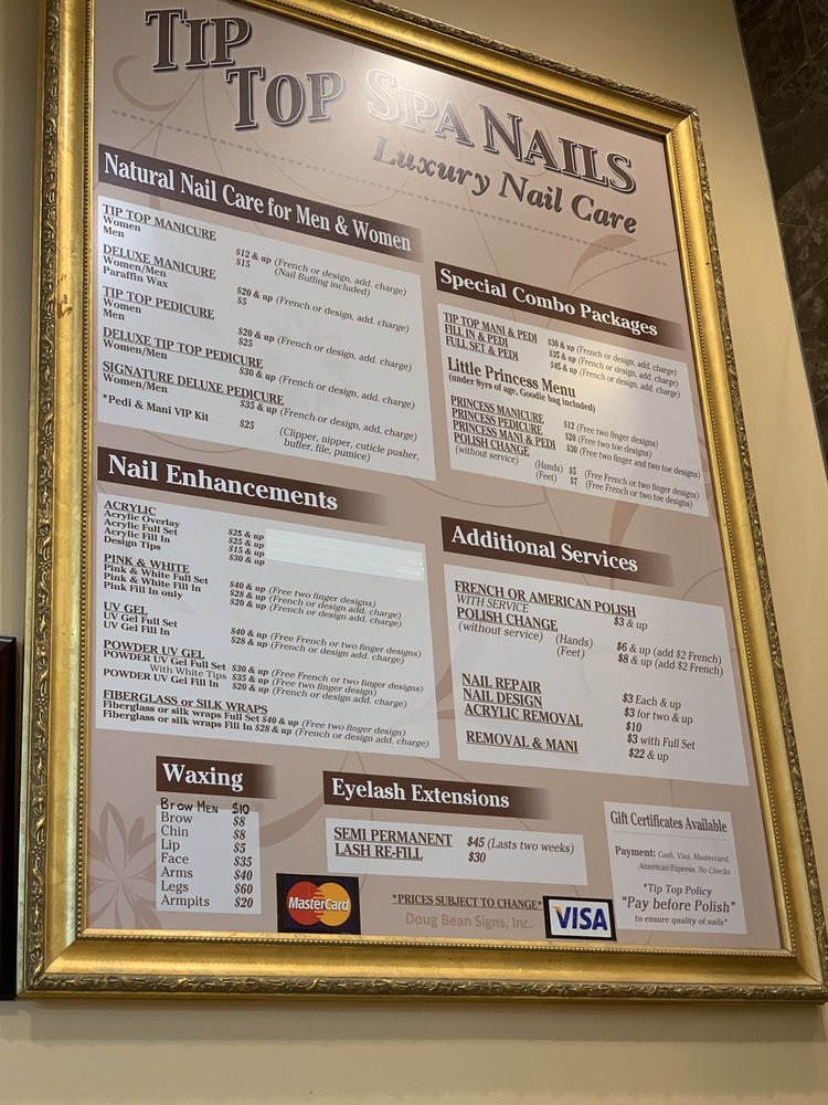 Great place the ladies are all so nice and professional I went in for a manicure and a pedicure also to get my eyebrows waxed it cost $90 and that was with the tip