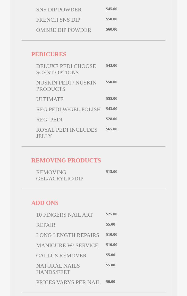 The staff here are great! Very reasonable prices and excellent service. Got a gel pedicure and manicure and they both look great. Will be coming back in the future!