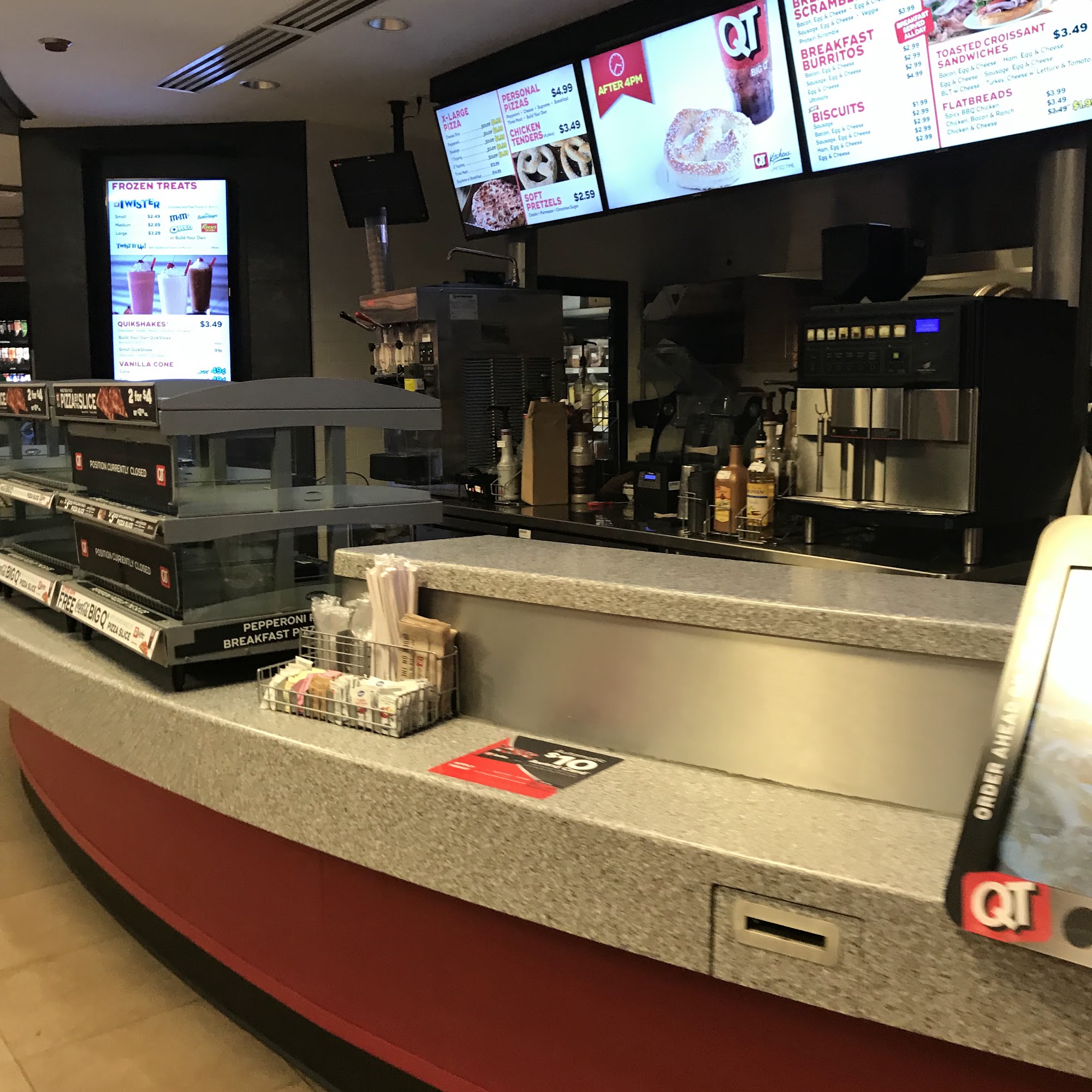 QuikTrip is a convenience store and gas retailer known for its signature customer service and dedicated employees. It features QT Kitchens® offering a menu of fresh pizza by the slice, personal and x-large pizzas, soft pretzels, sub sandwiches, wraps, grilled cheese, toasted croissants, breakfast pizza, and other delicious breakfast items. It also provides soft-serve vanilla cones, QuikShakes, and a famous fountain with more than 30 flavors of soda and tea, plus frozen drinks. The station is typically clean and often has some of the lowest gas prices around. It is considered a convenient quick mart for anytime, offering items like salads, fruit parfaits, and gasoline, saving customers hassle. Some locations include outdoor seating. Employees are generally friendly and provide top notch customer service, with specific staff members noted for being a huge help, such as when assisting with bulk gift card purchases. While usually a great place, experiences can vary. On some late-night visits, service can be slow if a cashier appears distracted or is on a personal phone call while ringing up customers. Despite this, many customers state they love QuikTrip and have never had a bad experience, affirming that QT is QT.