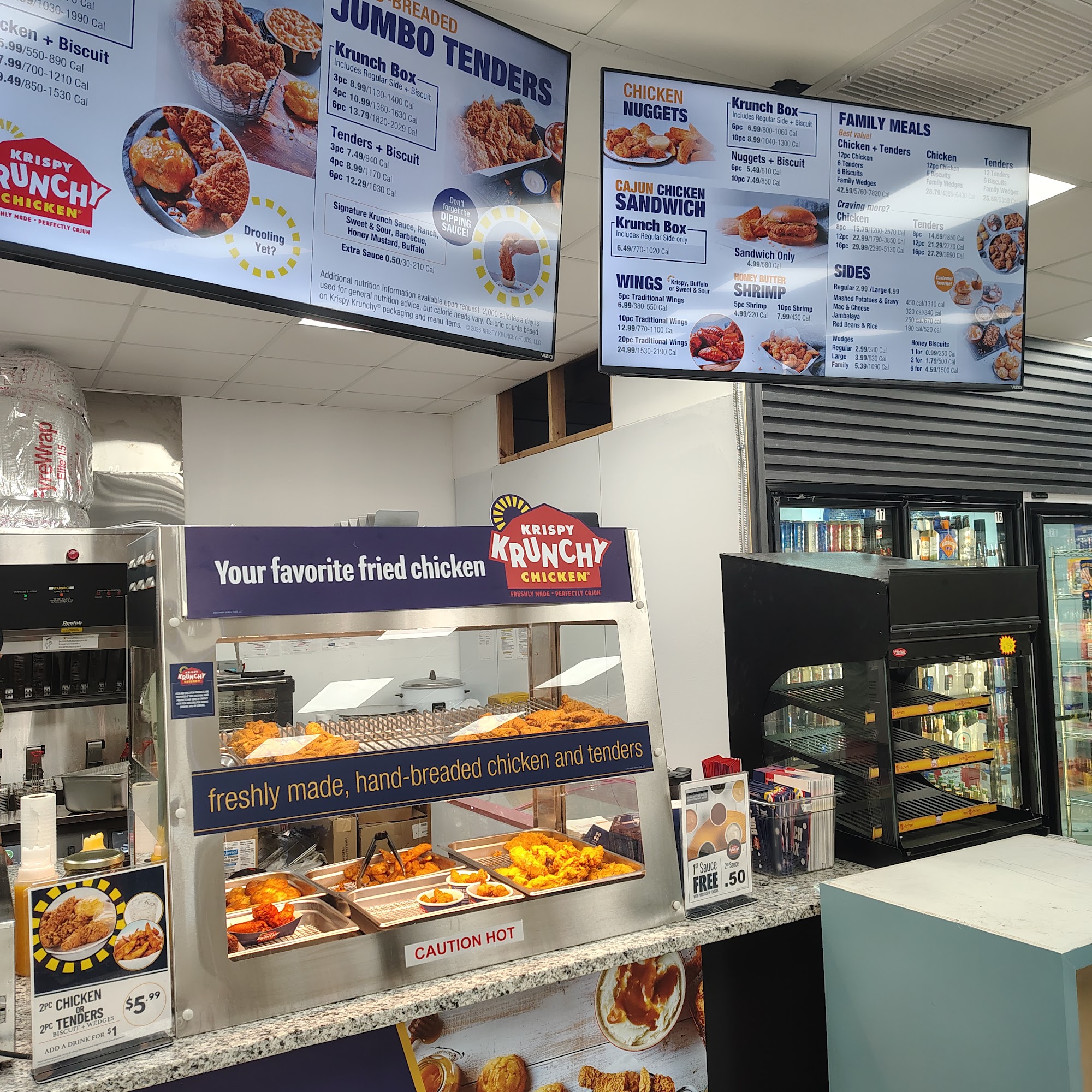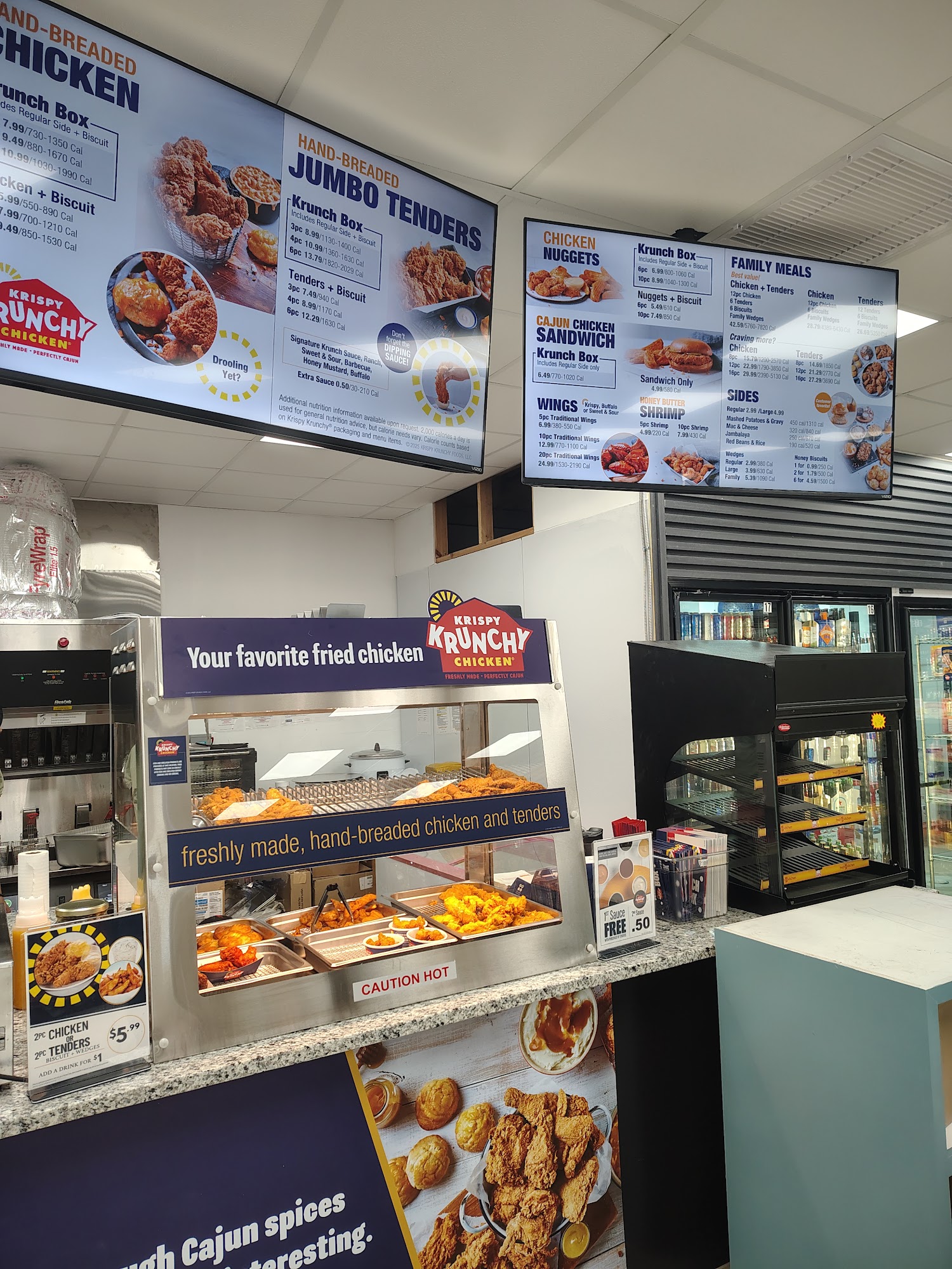 Helpful staff. Nice new clean location! They have a liquor store opening next to it and they sale Krispy Krunchy Chicken.