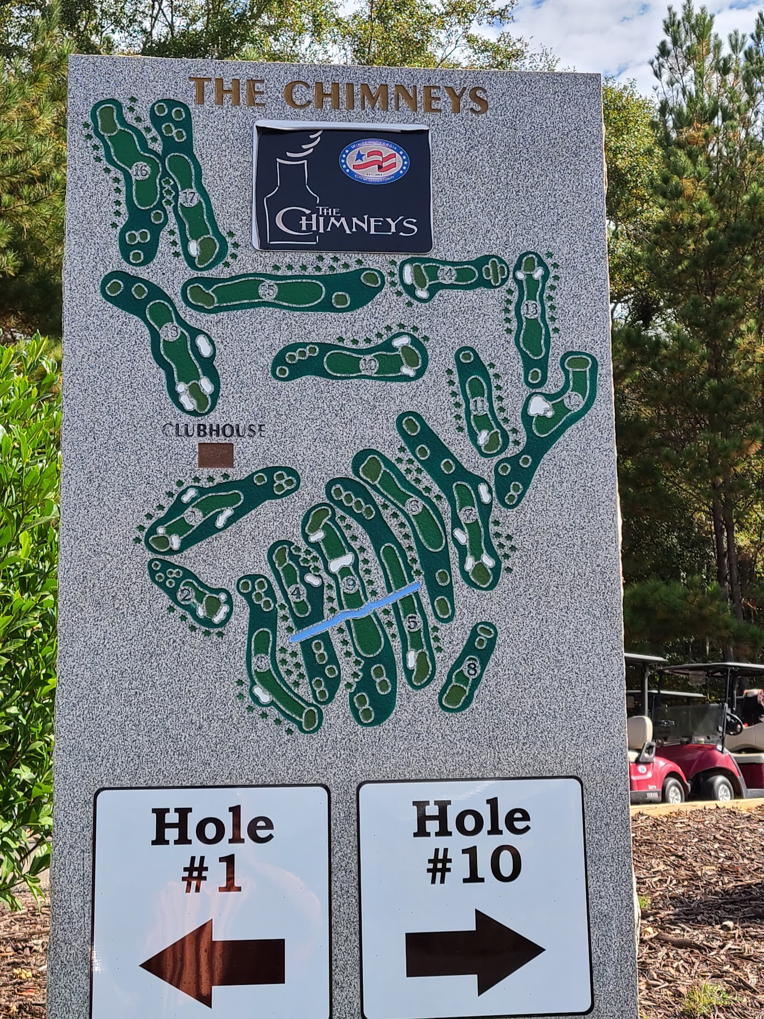 The Chimneys Golf Course is an 18-hole public course in north Georgia, offering an experience unlike any other with southern, hometown charm. It is an unbelievable and lovely course, well-kept and in great condition, featuring a mature treed area with a good number of interesting features. The course plays to a par 72 over five sets of tees, accommodating golfers of all abilities. Its signature feature is an abundance of native rock, intricately hand-laid to accent the greens, fairways, and pedestal tees. The greens are smooth and roll true, and the tee boxes are perfectly cut. The staff is excellent, friendly, helpful, kind, and enthusiastic. They are known for being very nice and for really caring about the golf experience. This top-rated course is easily a favorite, providing a wonderful time and a great place to golf where fellow golfers are courteous. It is absolutely awesome and always a great time, making it a destination worth traveling for.
