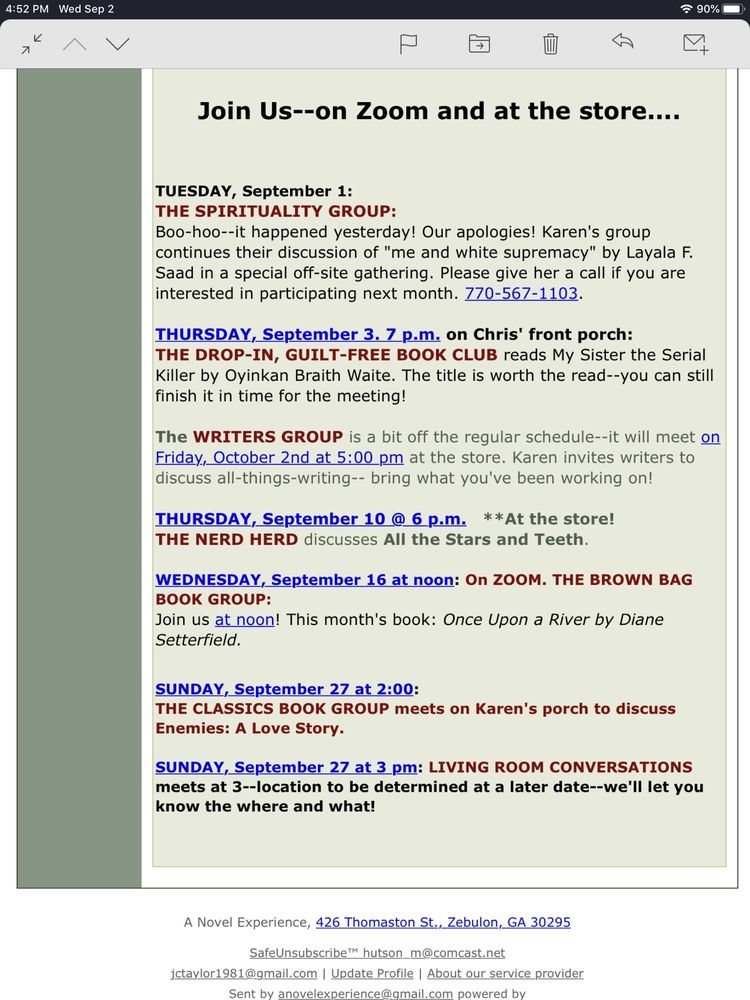 A Novel Experience is a gorgeous, cozy, and cool small-town bookstore with tons of books to choose from. It is beautifully curated with a wonderful selection, including new and terrific used books that are like new. The store overflows with genres like Tom Clancy and Christian books, and also has a nice young adult selection. It is a great place to get away, with big comfortable chairs and couches to peruse a find. The pleasant smell and real conversation add to the elegant charm. There is always an art exhibit hanging throughout, and the staff is very friendly, welcoming, and attentive. The prices are very reasonable, and the store is accessible for wheelchair users. It is a lovely and wonderful experience.