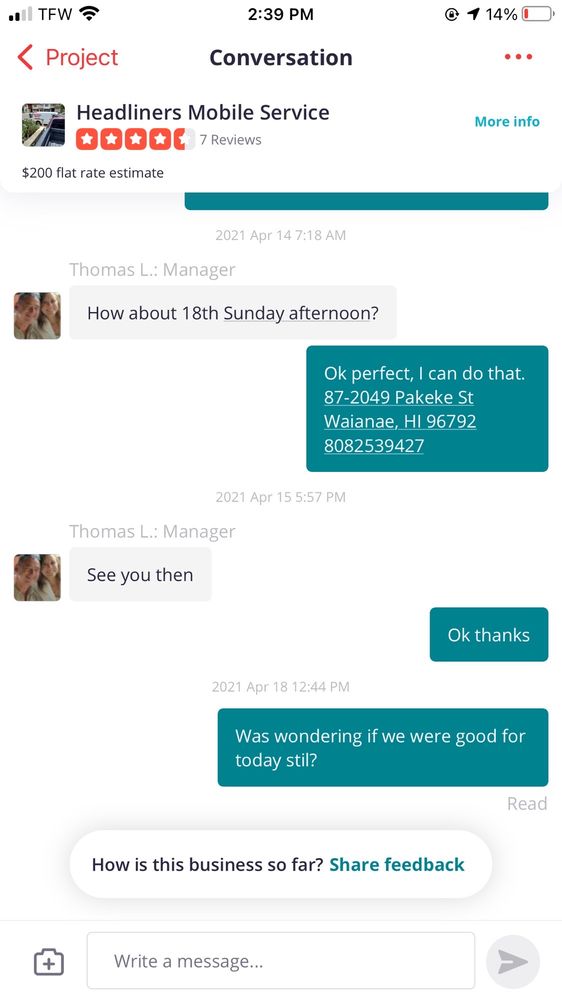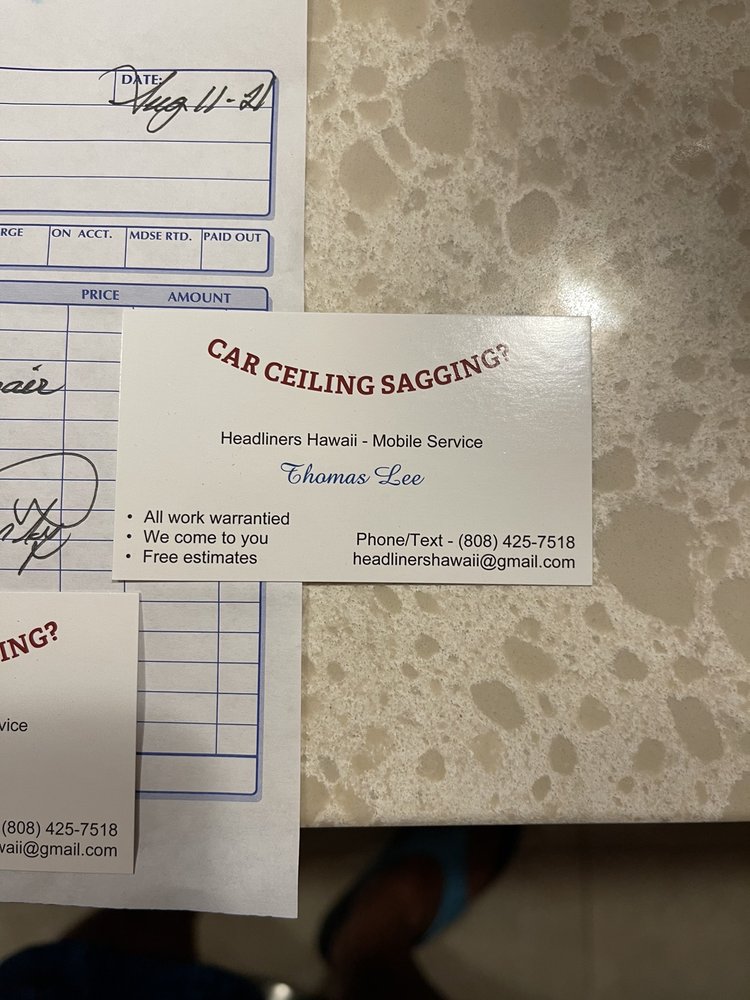 Headliners Hawaii Mobile Service is a reliable and efficient business that specializes in custom upholstery design and headliner repairs. Customers consistently praise the company's quick response, excellent service, and outstanding workmanship. The mobile aspect of the business is particularly appreciated, as it allows customers to have the repairs done at their own convenience without the need to transport their vehicle. Headliners Hawaii Mobile Service is known for its friendly and helpful staff, who work closely with customers to ensure their satisfaction. Whether it's a quick headliner replacement or a more complex upholstery project, the company delivers high-quality results at affordable prices, making it a highly recommended choice for those in need of such services in the Hawaii area.