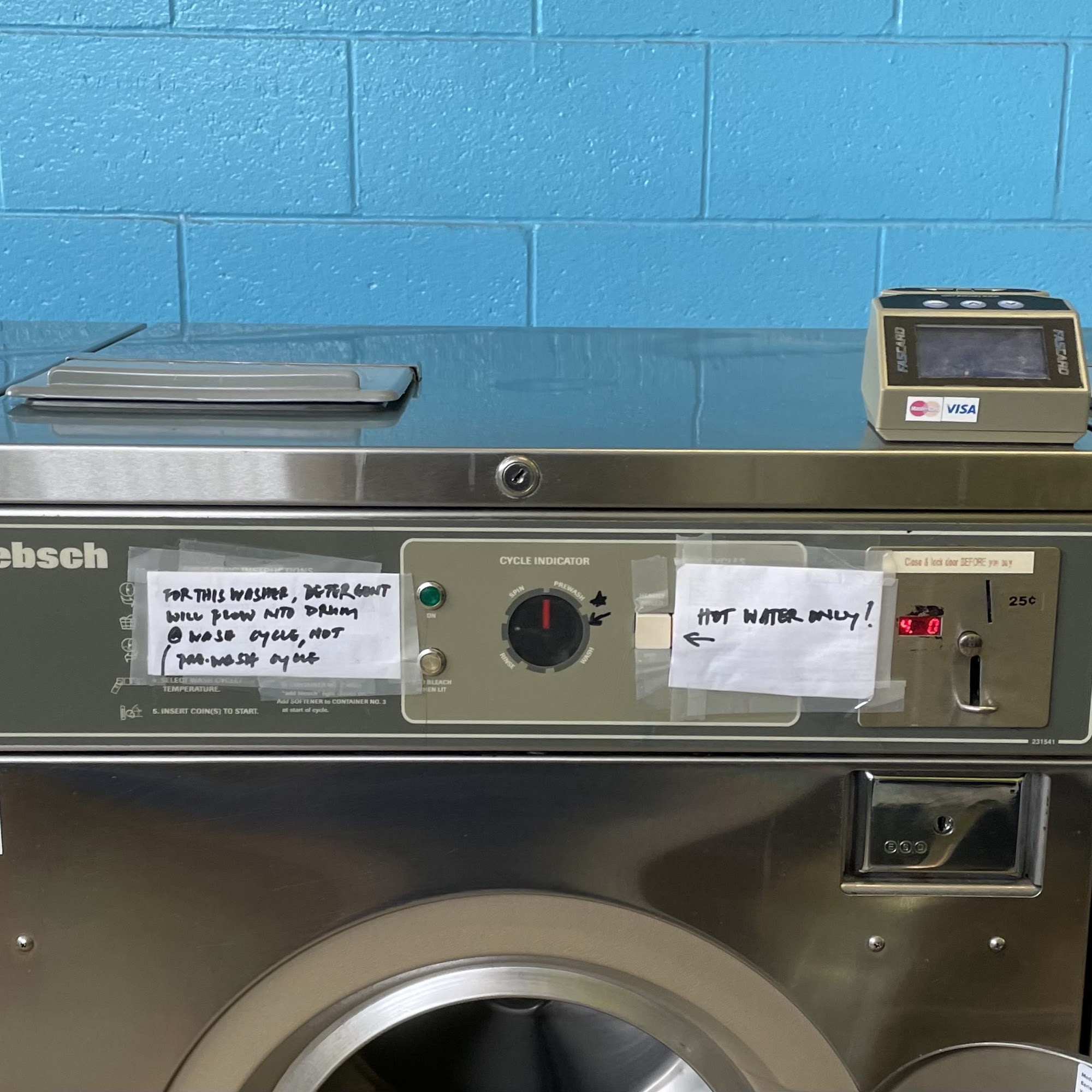 Self Service Laundromat. CASH ONLY. NO CREDIT CARDS. Change machine on site for you to swap paper money into quarters. Bring your own soap! We DO NOT have a soap vending machine. ATM and detergent for sale at the gas station located Mauka/end of our city block. Open 7AM. Last Wash 5PM; Last Dry 530PM; Doors Locked 6PM sharp!