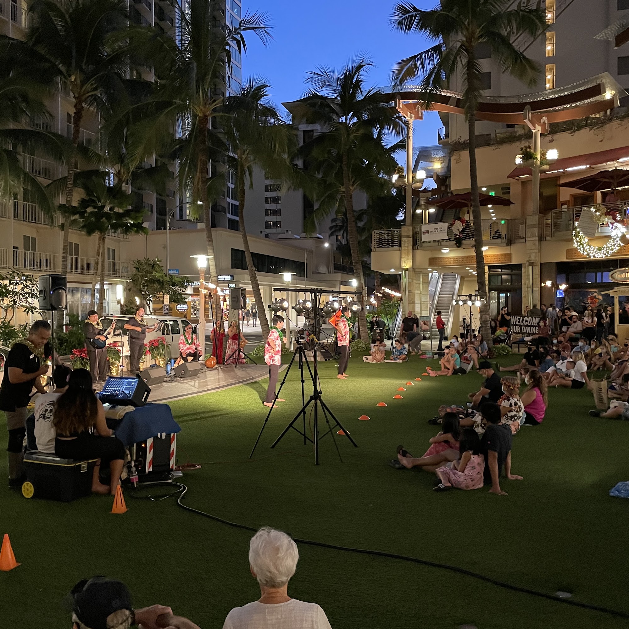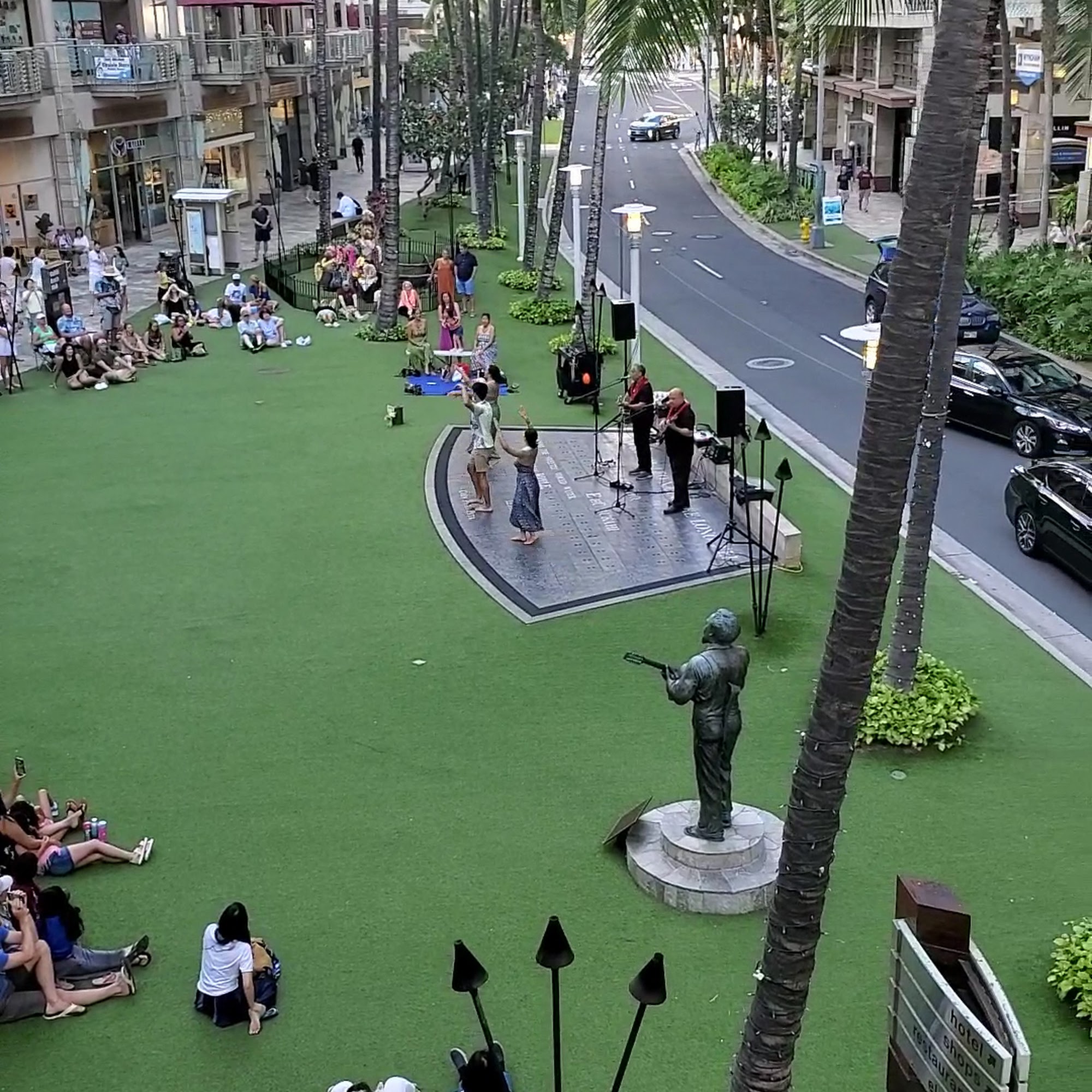 Waikiki Beach Walk is a lively area that combines modern entertainment with Hawaiian culture. Once a relaxed retail neighborhood owned by local family businesses, it has transformed into a vibrant space reminiscent of Las Vegas and San Francisco, with many brand name stores and interesting stands. Visitors can enjoy a nice walk along the street, illuminated at night by torches, and experience the lively atmosphere of Waikiki. Although it's not a pedestrian-only mall, Waikiki Beach Walk offers a variety of attractions, including free concerts on Lewers Street, just a block away, which feature local Hawaiian music and performances. One highlight is a family hula group called Kuahaheo, who perform captivating shows every Tuesday at 4:30 p.m., blending traditional Hawaiian dance with storytelling and music. The area also provides stunning views of the sunset over the sea, with the sky and water turning similar shades as the breeze blows gently and waves crash nearby. Overall, Waikiki Beach Walk offers a fun and relaxing environment for both locals and visitors, filled with good vibes, Hawaiian music, and cultural performances that showcase the beauty and traditions of Hawaii.