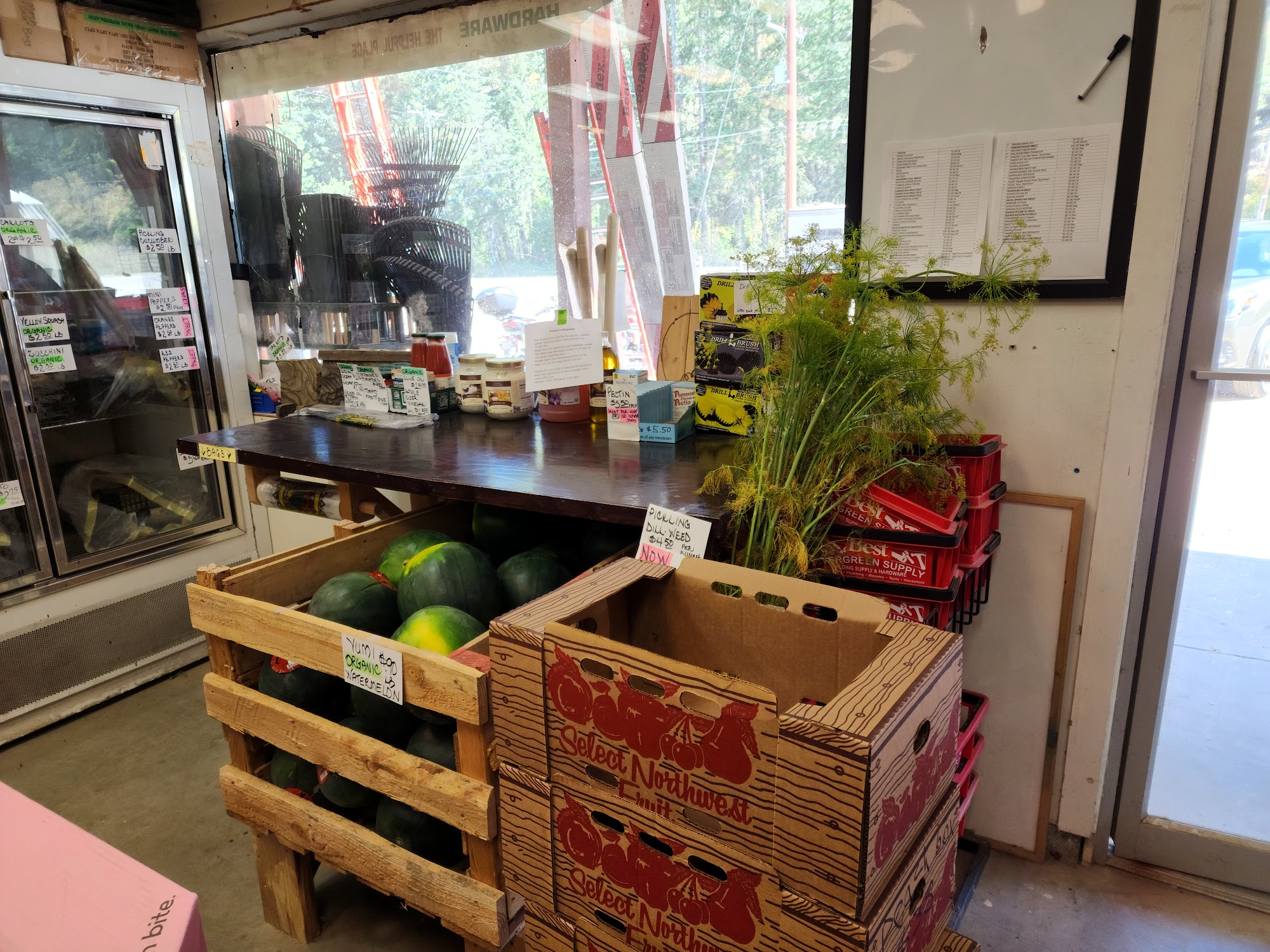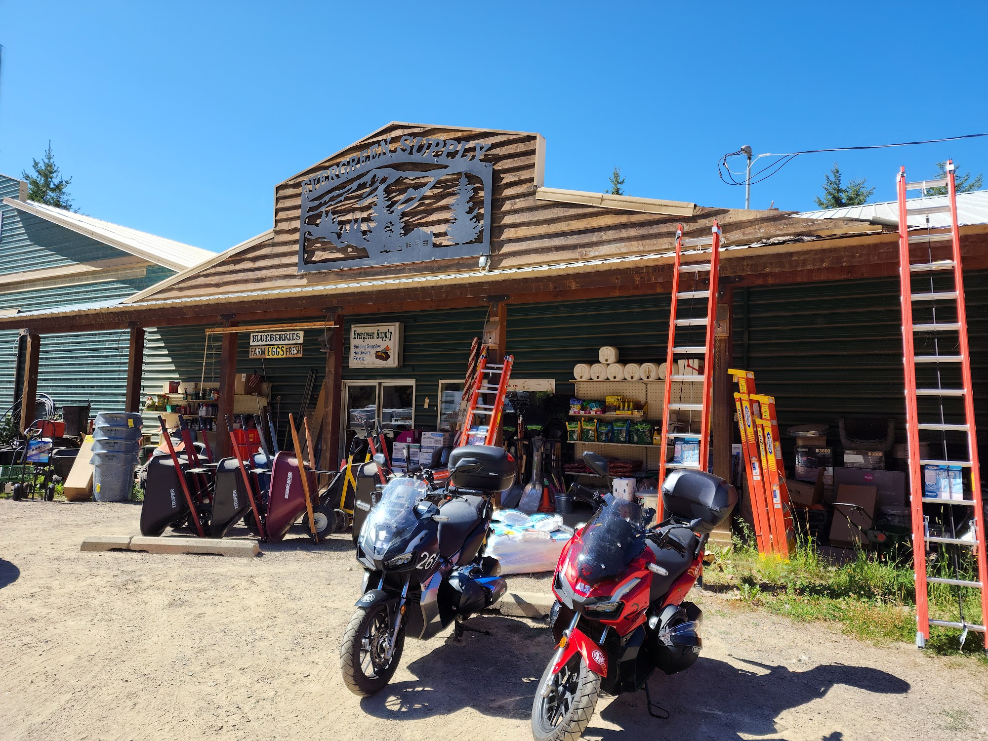 Evergreen Homestead Supply is a building and hardware store in the Clark Fork and Hope area. It offers the basics, common household items, and a few interesting oddments. The store also stocks a good selection of produce, including great fruits, vegetables, and eggs, with some uncommon varieties. Prices are reasonable. The friendly and helpful employees have what people need, making it a convenient and cost-saving alternative to driving the long distance to Sandpoint or other larger stores.