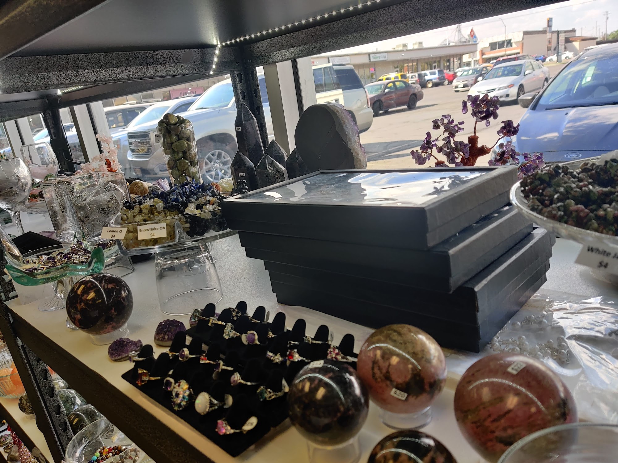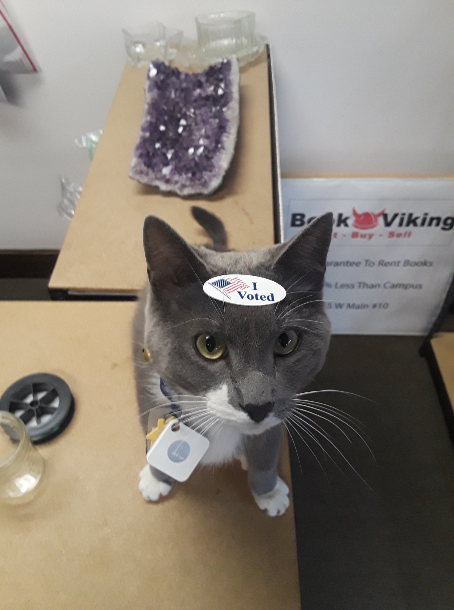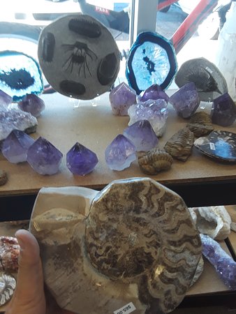 BookViking is a unique shop offering an interesting mix of textbooks and a rock shop. It features a great selection of crystals, stones, jewelry, crowns, trinkets, and music boxes. The environment is very cool and neat, with relaxing music. The staff and owners are amazing, very nice, friendly, helpful, community-focused, and know their books and their gems and minerals. A cat is sometimes present and is noted as very kind and the cutest. Some reviewers mention that certain rings are made of something odd, which can turn a finger a dark color or cause a skin reaction, advising customers to keep this in mind. Overall, people have had good experiences and recommend checking out the gem stock.