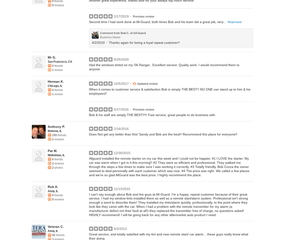 I can’t say enough good things about Bob and his team. I have brought him about six cars for window tint in other work and have been nothing short of impressed every time. Professional, does what they say they’re going to do and delivers on every promise. I will never take my car anywhere else.