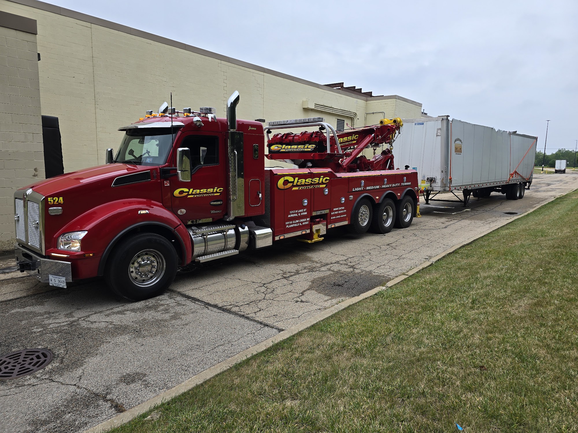 Classic Towing provides 24-hour light, medium, and heavy-duty towing in Aurora, Illinois and all throughout DeKalb, Kane, Will, DuPage, and Kendall County. In addition to towing service, our towing company offers accident recovery, Landoll transport, and roadside assistance, including: jump starts, lock-outs, flat tire changes, winch-outs, diesel delivery, and load shifts. We can tow anything from cars to motorcycles, box trucks to coach buses, and semi-trucks to tractor-trailers. So, when looking for local towing near you in Aurora or anywhere in the Chicago Metropolitan area, give us a call. We always have a tow truck ready to assist with car towing, motorcycle towing, semi-truck towing, and heavy duty towing for trucks and big rigs.