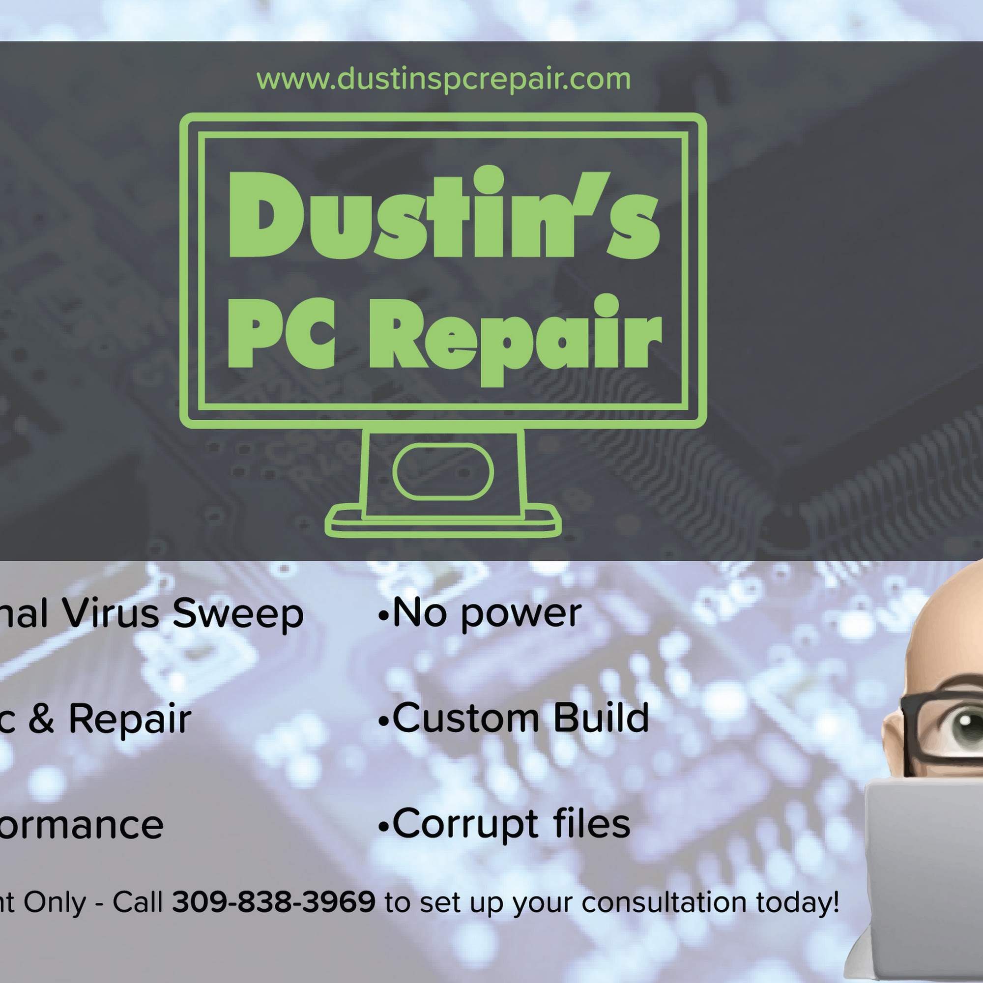 . Please Call to Book your Appointment for Drop-off . We know how intimidating your computer can be, so let us help. Why spend your day trying to solve your tech problems when Dustin's PC Repair can get you online in no time? Call Dustin's PC Repair! Let us do the work so you can kick back and enjoy. Repair saves you money. It saves the environment. And it connects us to our things. Ditch the throwaway economy.