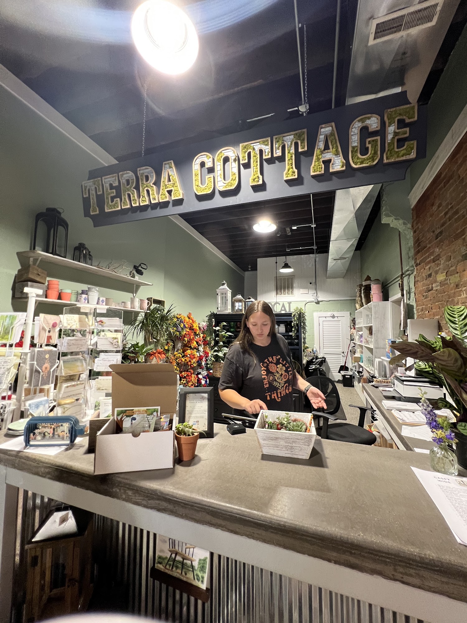 Terra Cottage, LLC is a plant and flower shop known for its beautiful display arrangements and wide variety of plants, pots, and accessories. They offer a station for customers to create their own succulent gardens. The staff is friendly, professional, and attentive to customer needs, providing great service. Additional dirt is available for planting succulents or cacti.