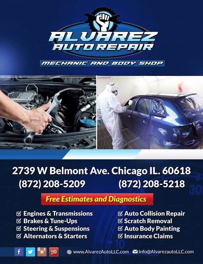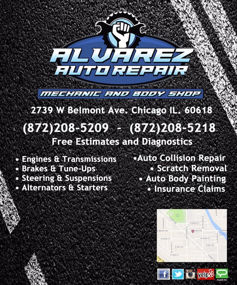 Alvarez Auto Repair located at 2739 W Belmont Ave in Chicago, IL services vehicles for Auto Parts, Oil Change and Lube, AC and Heating Repair, Alignment Repair, Auto Repair, Brake Repair, Diagnostic Services, Electrical Repair, Engine Repair, Tire Balancing, Transmission Repair, High Performance Parts, General Maintenance, Body Work and Paint, Catalytic Converter Recycling, High Performance Modification, European Car Repair, Tire Repair, High Performance Tires. Call (872) 208-5209 to book an appointment or to hear more about the services of Alvarez Auto Repair