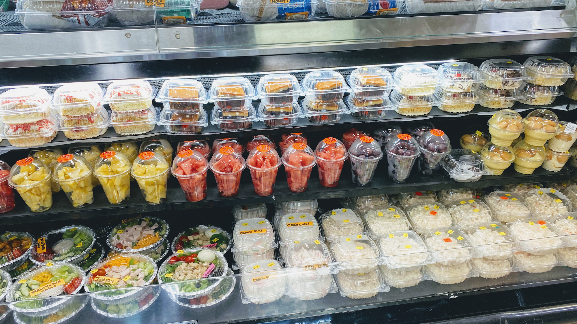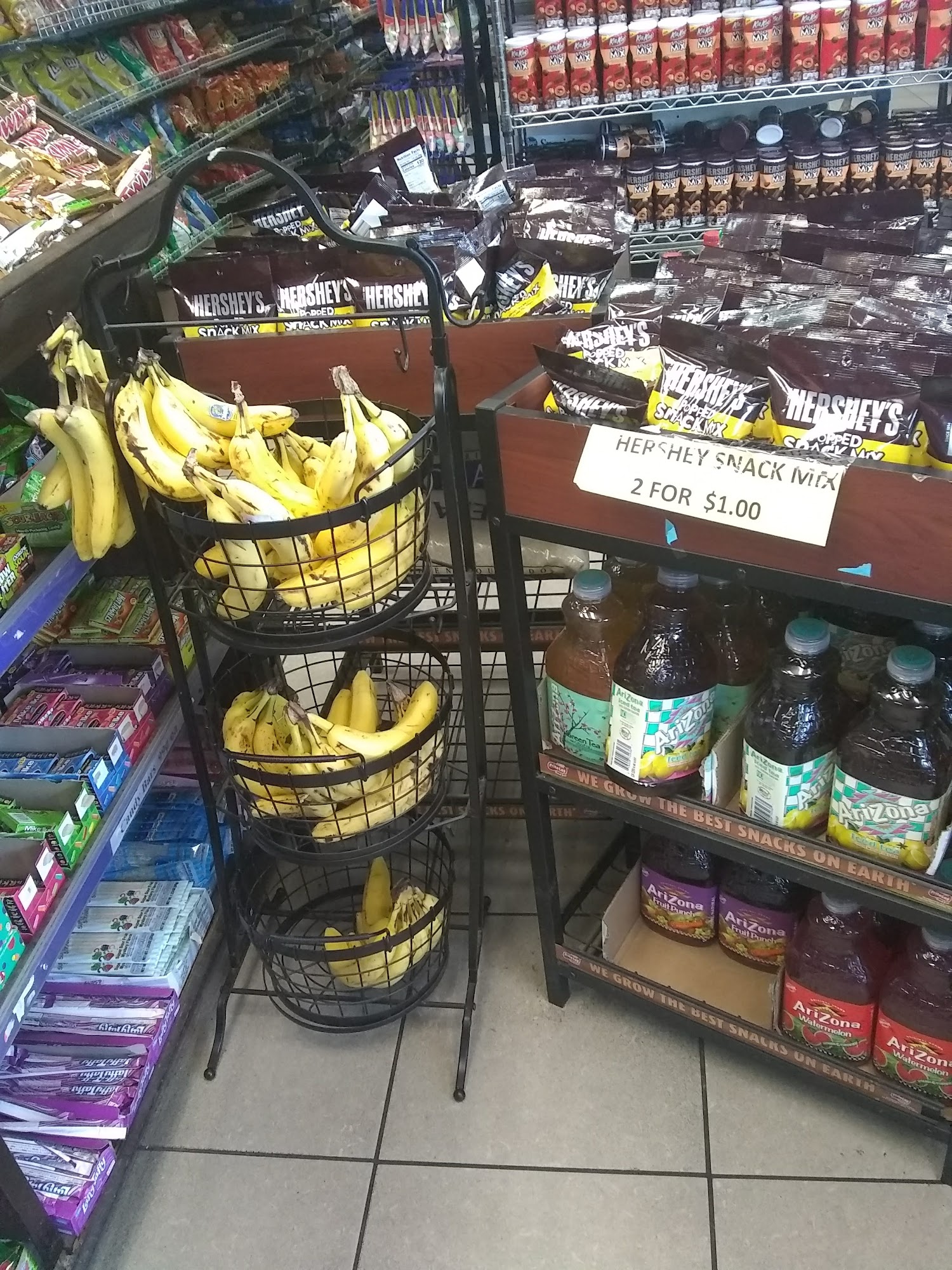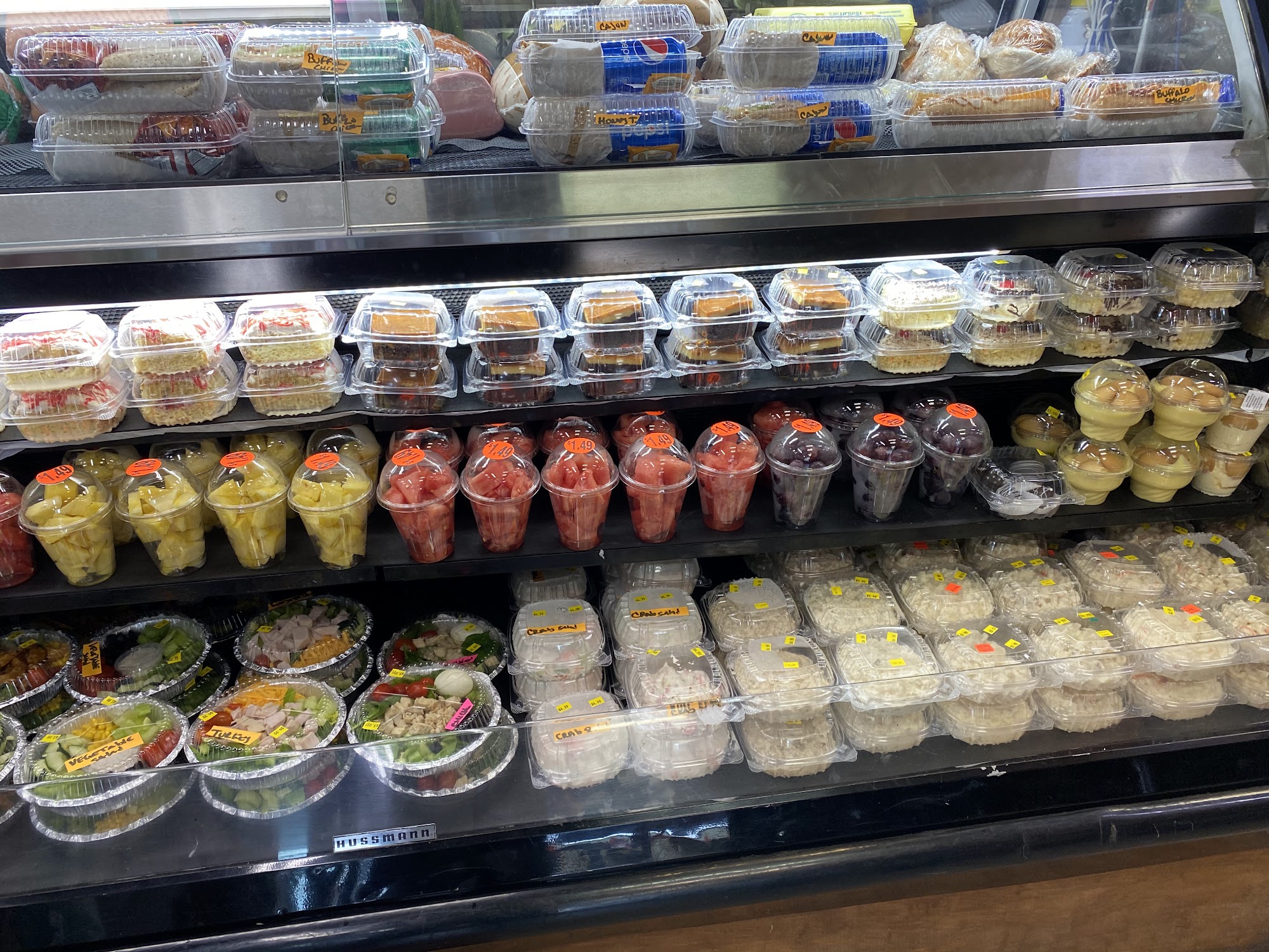 Full line off grocery FRESH chicken and fish and steak. FRESH salad sandwiches and fruits. Fruit cups Corn in cup Slushy Tobacco accessories. All tobacco products. Cold drinks. Coffee. Candy 2/$99c. Snacks. Frozen food. Produce. Copy keys. Phone minutes. Speaker.