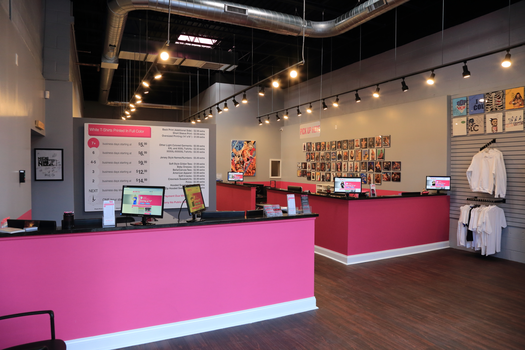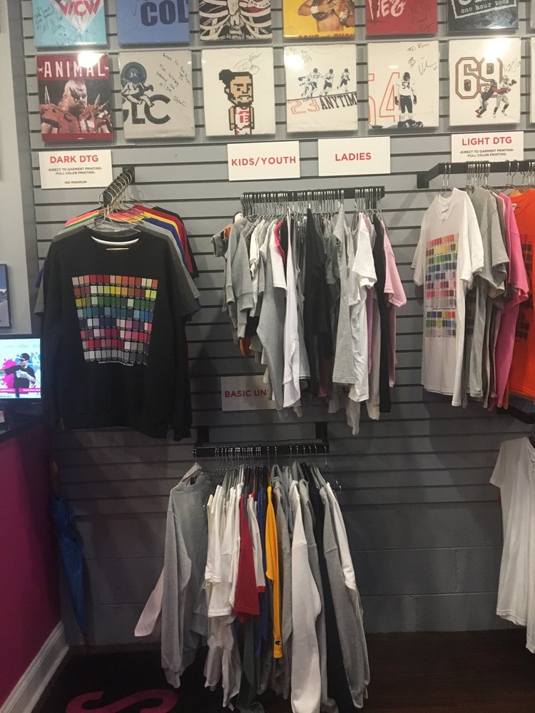 "One Hour Tees" is AWESOME - you design, order online and voila...done that day!! Oh, have a question, but can't find your answer online...they ANSWER THEIR PHONE too! And pick up is fast and easy too!!