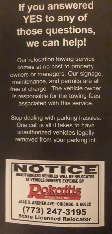 Vehicle was illegally towed from parking lot of Staples at 1130 S. Canal. Very shady company. No manager available to dispute. Demanded payment and drivers license from behind a tinted glass where you can not see them and raised the cost of towing after I became reasonably upset. Reported to police and BBB.