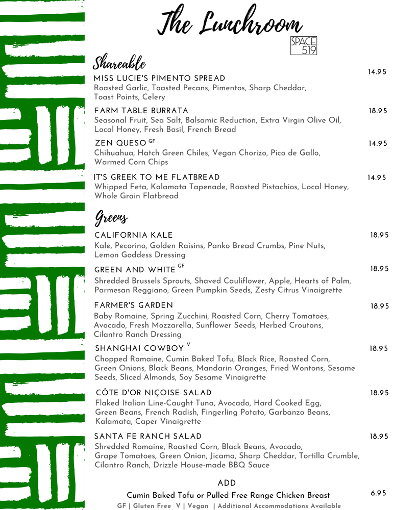 SPACE 519 is a small department store located just off The Magnificent Mile in Chicago's Gold Coast neighborhood. Owners Lance Lawson and Jim Wetzel travel the world to curate an assortment of unique and hard to find items across a broad range of categories: including designer women's apparel and accessories, fine jewelry, luxury apothecary, inspired home goods, fancy foods and unique gift items. Within the store sits The Lunchroom - a 40 seat sit-down breakfast, lunch, and weekend brunch restaurant focusing on California-style farm fresh cuisine as well as The Lunchbox - for counter service barista drinks and gourmet grab and go. In the warmer months The Lunchroom features a 24-seat dog friendly sidewalk patio.