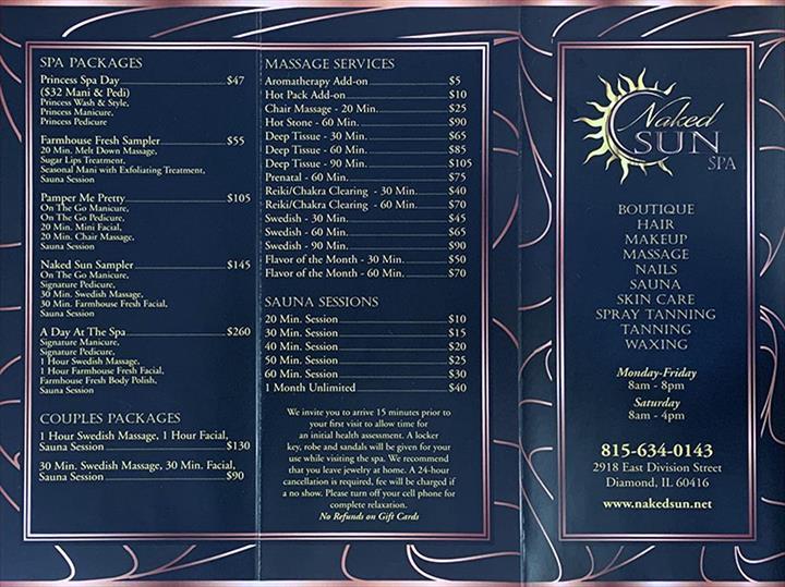 Naked Sun LLC is a premier tanning and beauty salon serving the surrounding areas of Diamond, IL. They offer a range of services, including tanning, nail care, and haircuts. The salon provides a personal and exciting experience, with knowledgeable and talented staff. Their tanning beds are clean and well-maintained, making them a top choice for those seeking a high-quality tanning experience. Whether you're looking for a UV tan or a spray tan, the staff at Naked Sun LLC are happy to help and provide excellent service. They are a reliable and trustworthy salon that goes above and beyond to ensure customer satisfaction. Customers praise the salon's friendly and inviting staff, who make sure to keep them involved in the process and attend to every detail. The nail services, including pedicures and manicures, are highly regarded, with customers noting the excellent work of the technicians. The salon also offers a range of other services, such as facials, which customers are eager to experience.