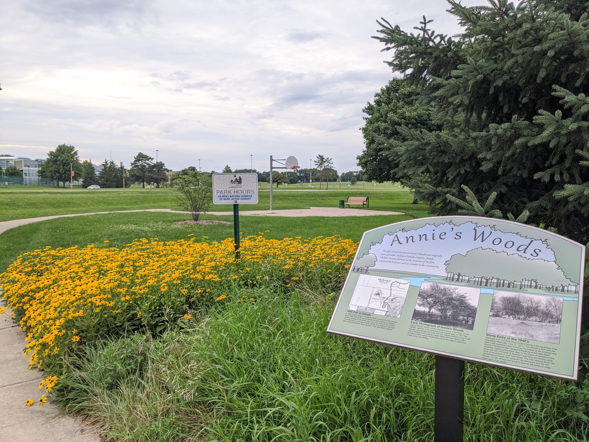A pleasant little park, though the name is poorly chosen. I don't think they're more than a dozen trees there. That said, it's right by the NIU campus, has facilities for sports and picnics and is up against the Kishwaukee River. So there's plenty to enjoy.