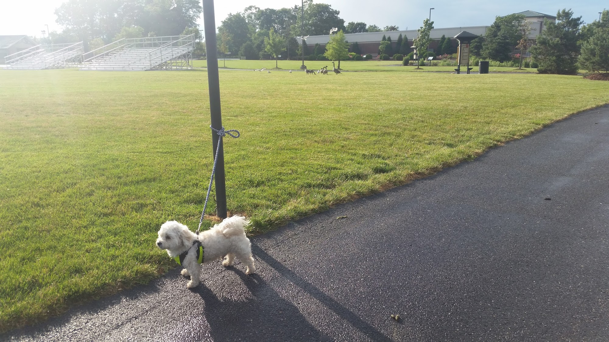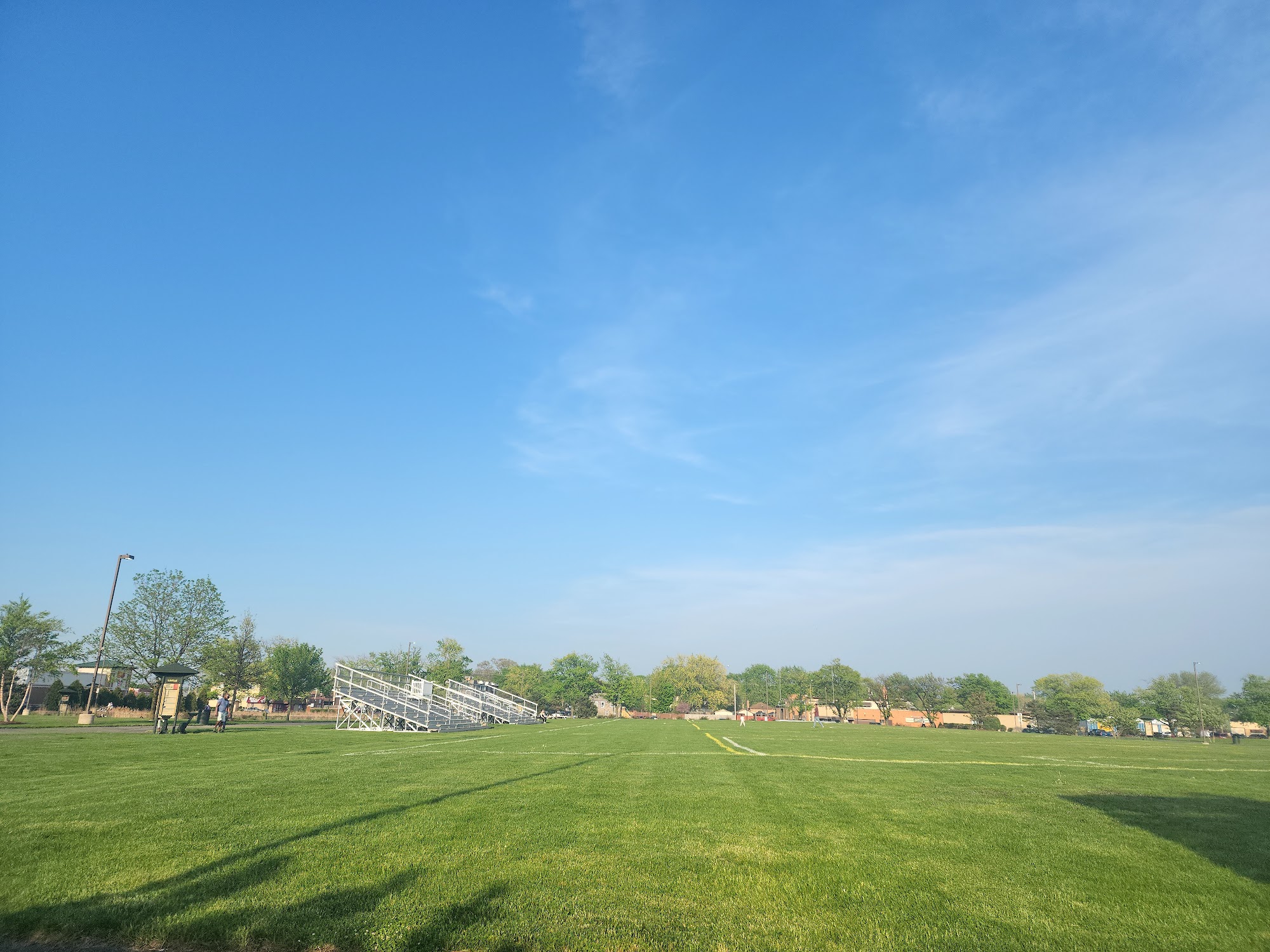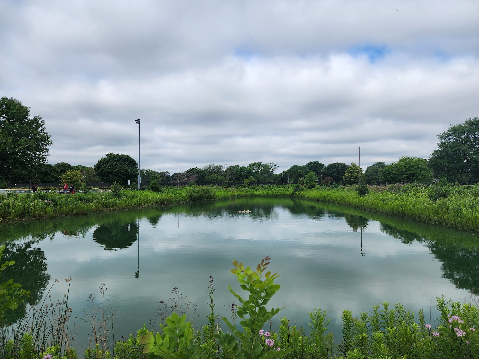 Yukich Field is a nice average park, a quiet little gem, and a beautiful park with flowers and several ponds. It is peaceful, serene, clean, open, and safe to walk anytime of the day or night. The well-manicured walking paths are ready for a walk, run, or speedwalk. It is a very dog friendly park where people walk their dogs, though some do not pick up after them. There are picnic areas with plenty of available grass and often picnic tables. The playground is very open and easy to watch children. Restrooms are available, including clean and accessible ones, though the main restrooms sometimes cannot be used. Parking is good and nearby.