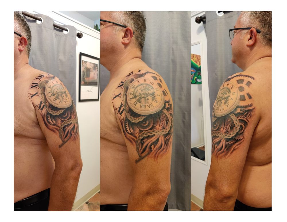 Explosive Ink Tattoo is a well-established tattoo studio located on the IL/WI Stateline, proudly serving the community since 2007. The husband-and-wife team, tattoo artist Bret and office manager Lisa, are committed to providing high-quality, safe, and affordable tattoos to their clients. The studio is OSHA/Bloodborne Pathogens certified yearly and licensed by the Illinois Department of Public Health, ensuring the highest standards of cleanliness and safety. Additionally, Explosive Ink Tattoo has been accredited by the Better Business Bureau since 2017, reflecting their dedication to excellent customer service. Bret's professional integrity and artistic talent are evident in the diverse range of tattoos he creates, from original designs to cover-ups. Clients praise his meticulous attention to detail, creativity, and versatility in both black-and-white and color work. The studio welcomes tattoos of all sizes and styles, and Bret works closely with clients to ensure the placement and sizing of the tattoo are just as important as the content. Customers consistently express their satisfaction with Explosive Ink Tattoo's services, highlighting the reasonable pricing, friendly staff, and clean, well-maintained studio environment. The studio's reputation for exceptional work and customer care has earned it a loyal following, with many clients returning for additional tattoos and touch-up work.