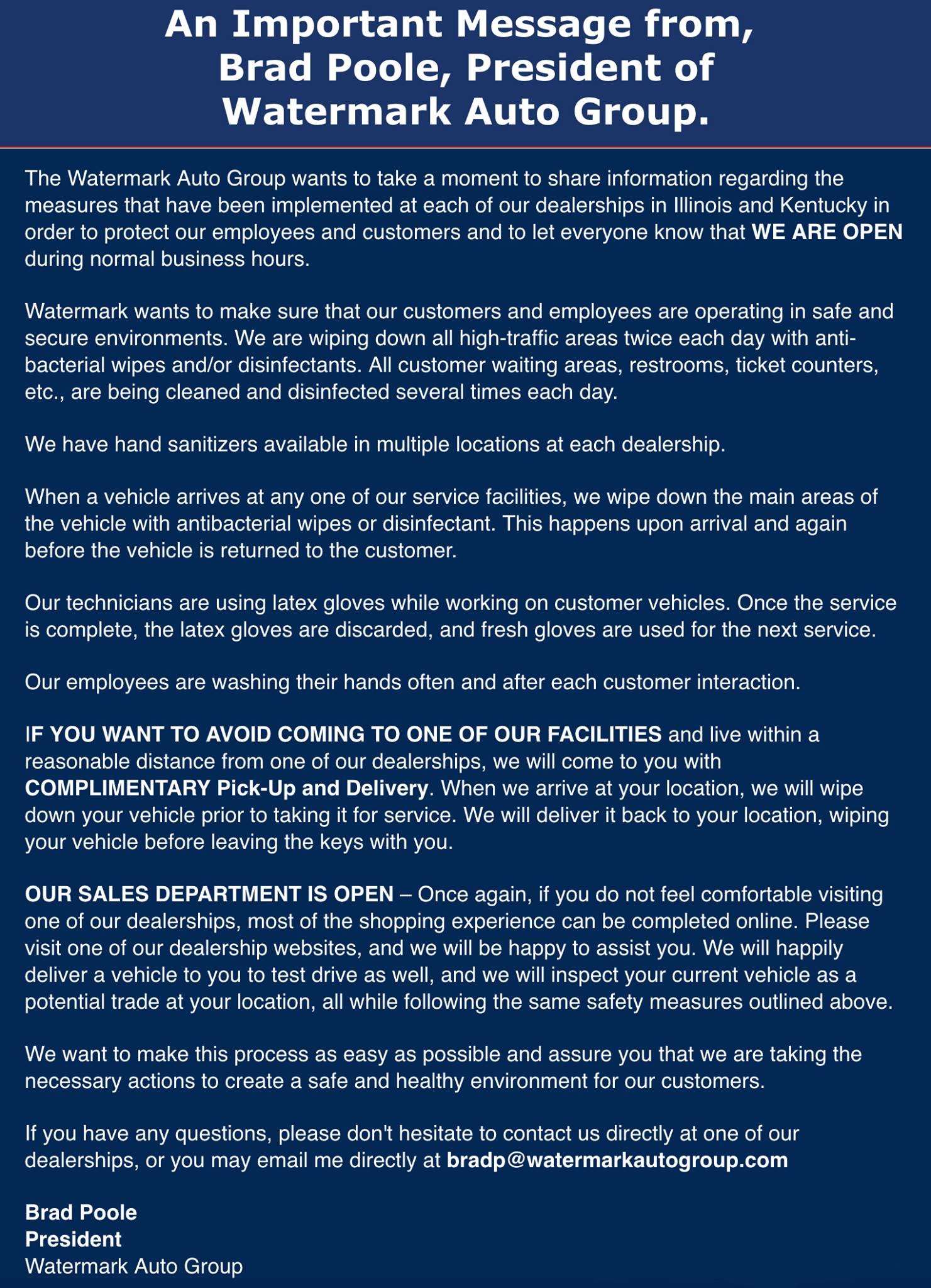 I have nothing but good to say about Watermark Auto Group! All of their employees, no matter which department, have always shown courtesy and care to their customers. They really go above and beyond with exceptional customer service!!