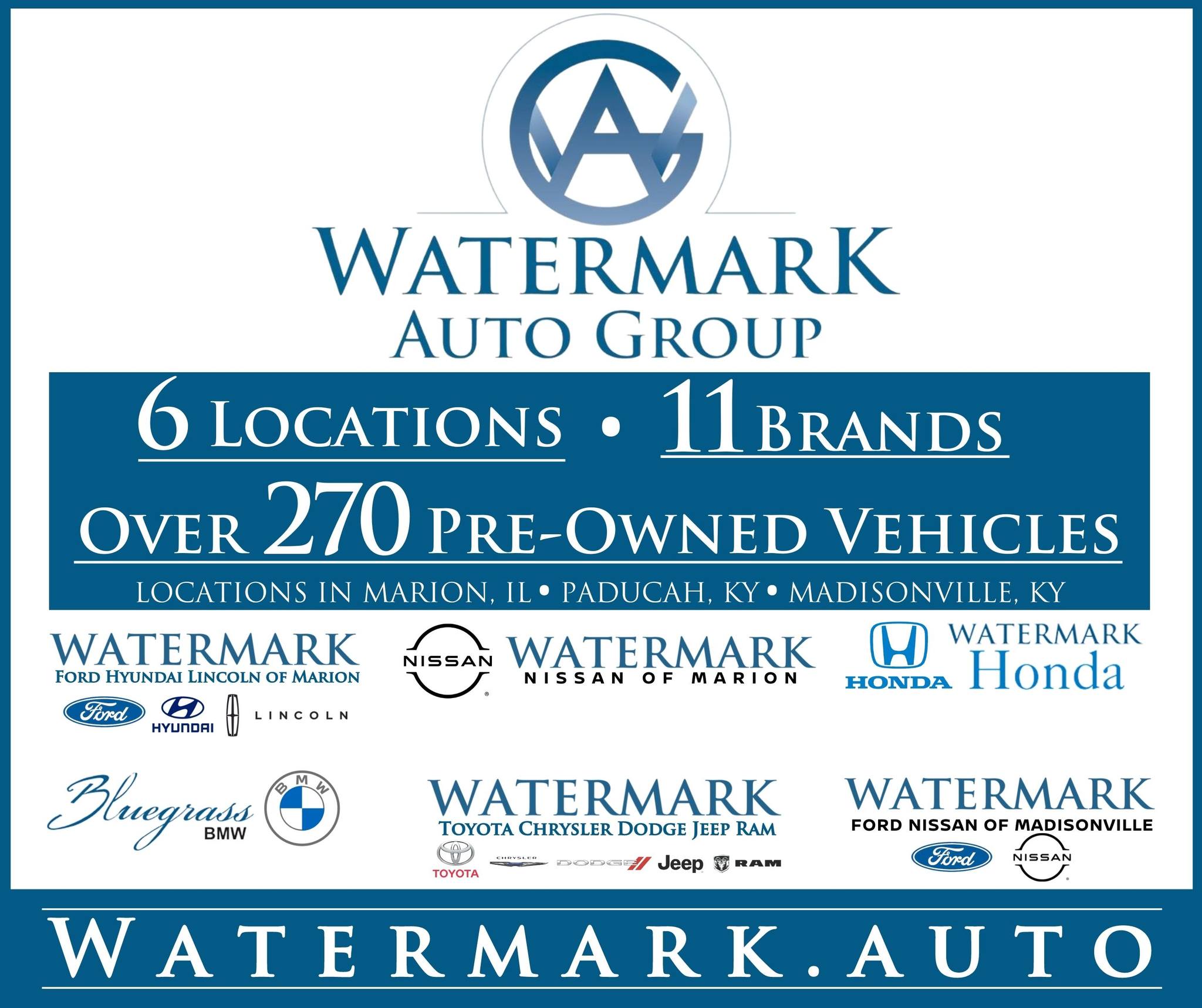 The Watermark Auto Group is headquartered in Marion, Illinois, with 7 dealerships in the region and 13 brands, including rooftops in Marion, Illinois; Harrisburg, Illinois; Paducah, Kentucky; and Madisonville, Kentucky. The company has rapidly expanded operations within the Southern Illinois/Western Kentucky footprint and is the auto industry leader within the region in terms of sales, employment and community involvement. Give a Watermark dealership a shot and you will not regret it!