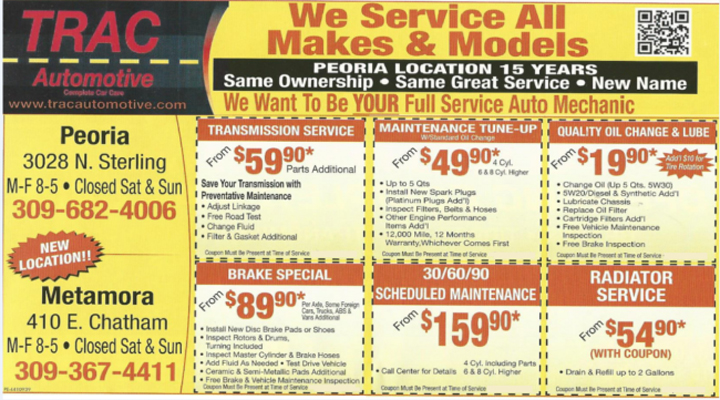 Trac Automotive, in Metamora, IL, is the area's leading automotive specialist serving Peoria and the surrounding areas since 1997. We specialize in oil changes, air conditioning, brakes, tires, alignments, engines, transmissions, diagnostics and more. For all your automotive needs, contact Trac Automotive in Metamora. We are now hiring! Stop in or call us for more information!
