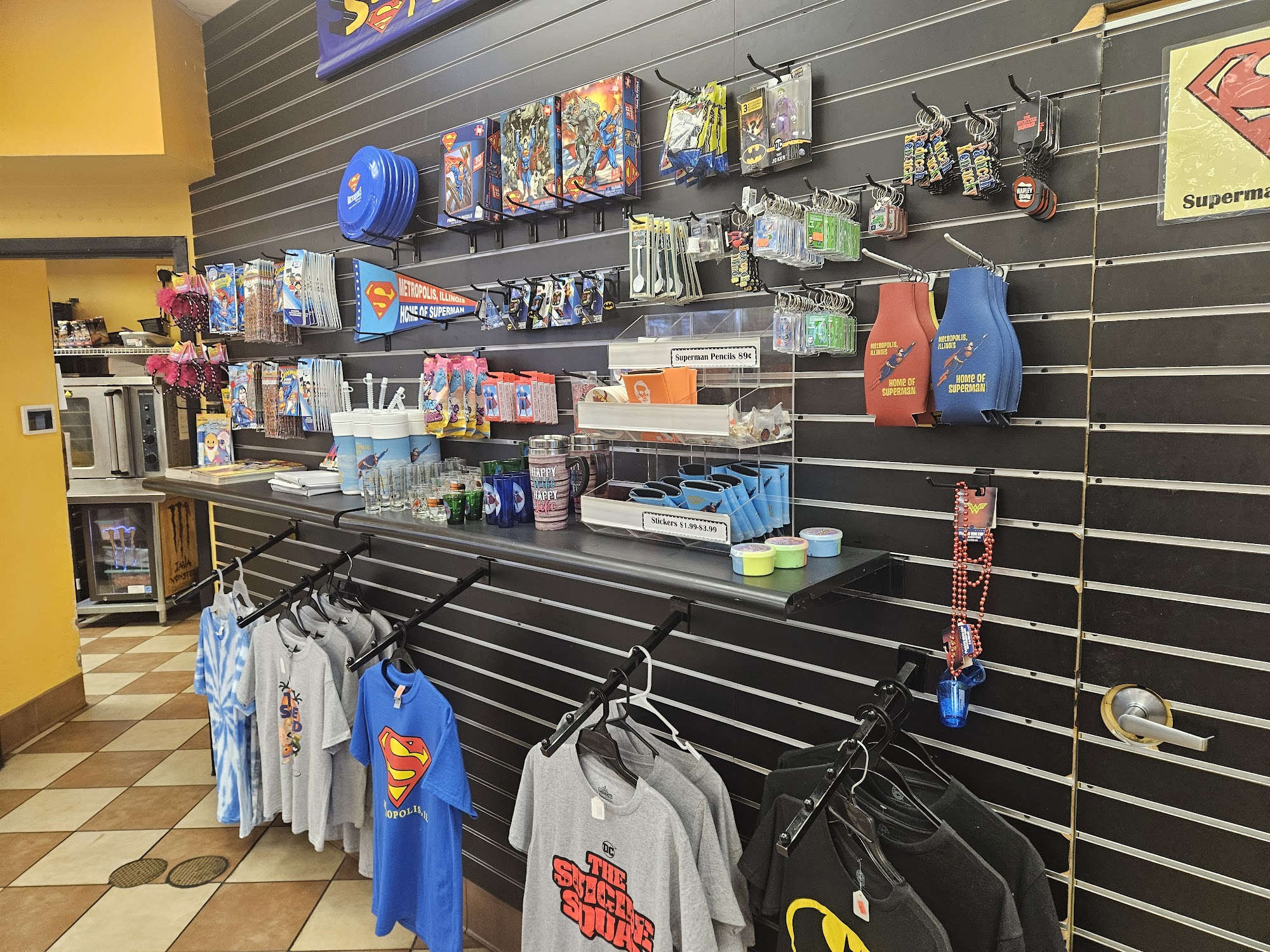 Great place to stop for snacks and souvenirs. Action figure themed as its in metropolis. Superman or woman will feel right at home. Friendly staff. Good variety to eat. Always make sure to stop while traveling through.