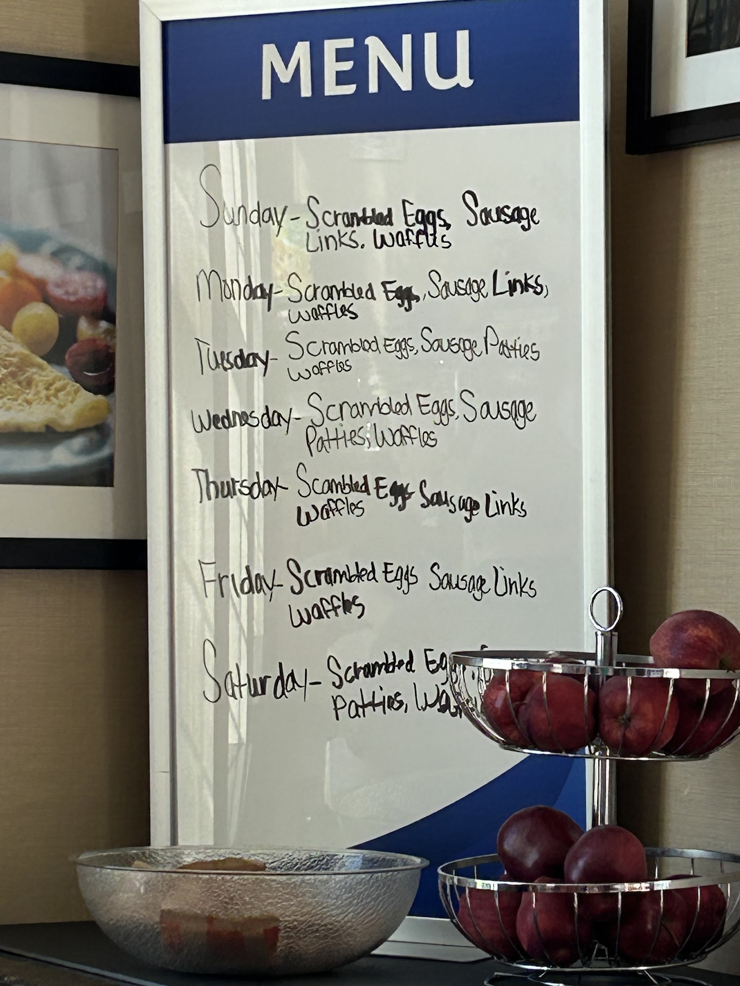 Very clean, and fresh, and relaxing, staff was very professional, and kind, and the indoor pool was the perfect way to relax after a long day, I highly recommend this Hotel if you are ever in Moline...their breakfast includes apple and orange juice, cereal, eggs, sausage, yogurt, and waffles.