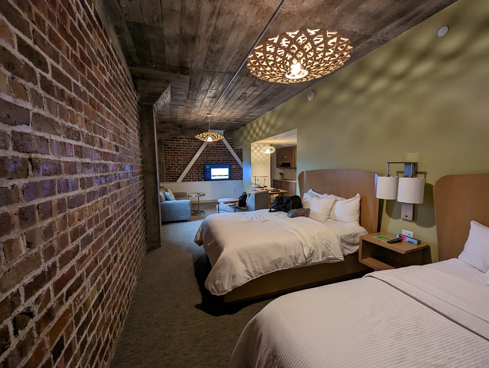 Element Moline is a unique and inviting hotel that offers a memorable stay for all guests. Housed in a renovated warehouse with a boho flair, the hotel features spacious, stylish rooms with modern amenities such as darkening shades, separate sitting areas, desks, and full kitchenettes in the king suites. The rooms are very clean, comfortable, and perfect for solo travelers, families, or business guests. Many guests appreciate the quiet atmosphere and the loft ceilings that add to the charm. The hotel’s breakfast service is highly praised, especially for its made-to-order omelets, hot breakfast potatoes, scrambled eggs, sausage, and a variety of pastries and drinks. The breakfast area includes a custom omelet bar, yogurt parfait bar, and fresh fruit, providing a fabulous start to the day. The staff at breakfast can sometimes be disorganized, but overall, the friendly front desk and helpful staff enhance the experience. Guests enjoy the numerous amenities available, including a full workout facility, pool, and a game room/bar with 28 self-serve taps sold by the ounce. The location is walkable, just a short stroll to a classic American street with diverse eateries like Chicago-style pizza, Thai, Mexican Fusion, Chinese, and ice cream shops. Pets are welcome, with treats and toy bags provided, adding to the family-friendly atmosphere. Whether for a staycation, business, or leisure, Element Moline offers a budget-friendly, fun, and comfortable experience in a distinctive setting.