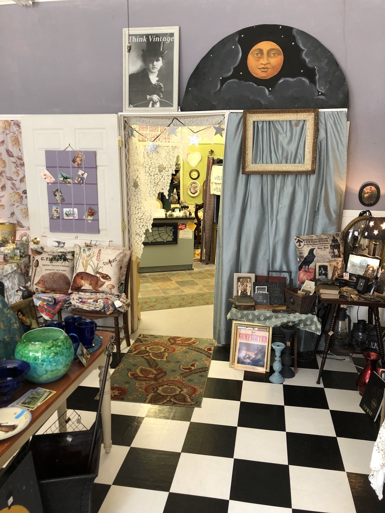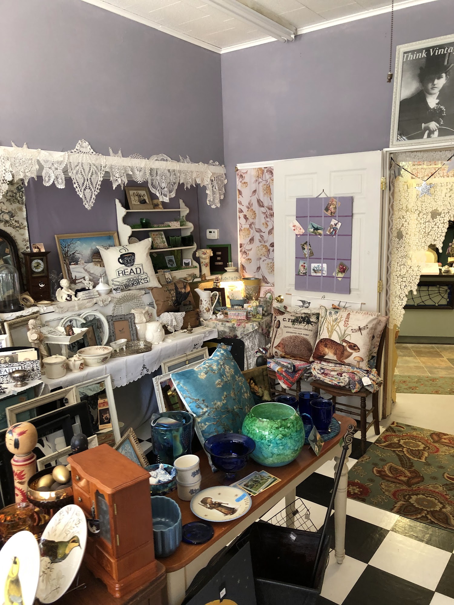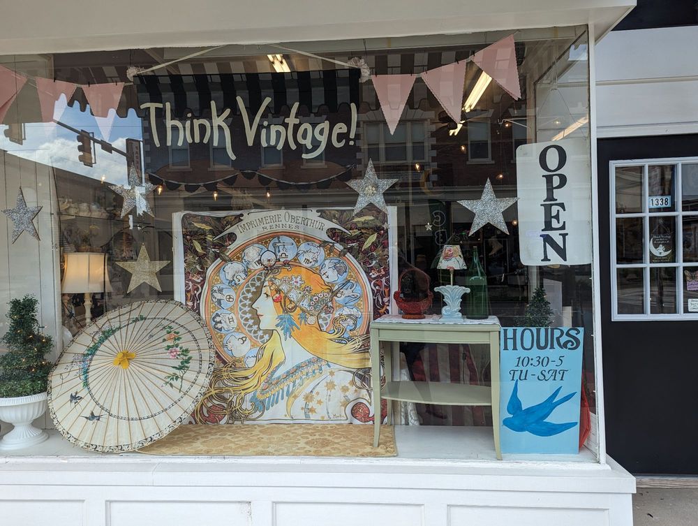 Think Vintage! is a very unique and whimsical vintage gift and curio shop. It is not your average shop, filled with tons of cool vintage merch and unique items. The store carries home decor, flowery china, colored glass, old books, linens, children's decor, costume jewelry, miniatures, fairy treasures, and mysterious necessities. The place is clean and inviting with extremely reasonable prices. The owner is super nice and sweet. It is a favorite store for many, offering a little vintage and a little nostalgia for anyone to find interesting.