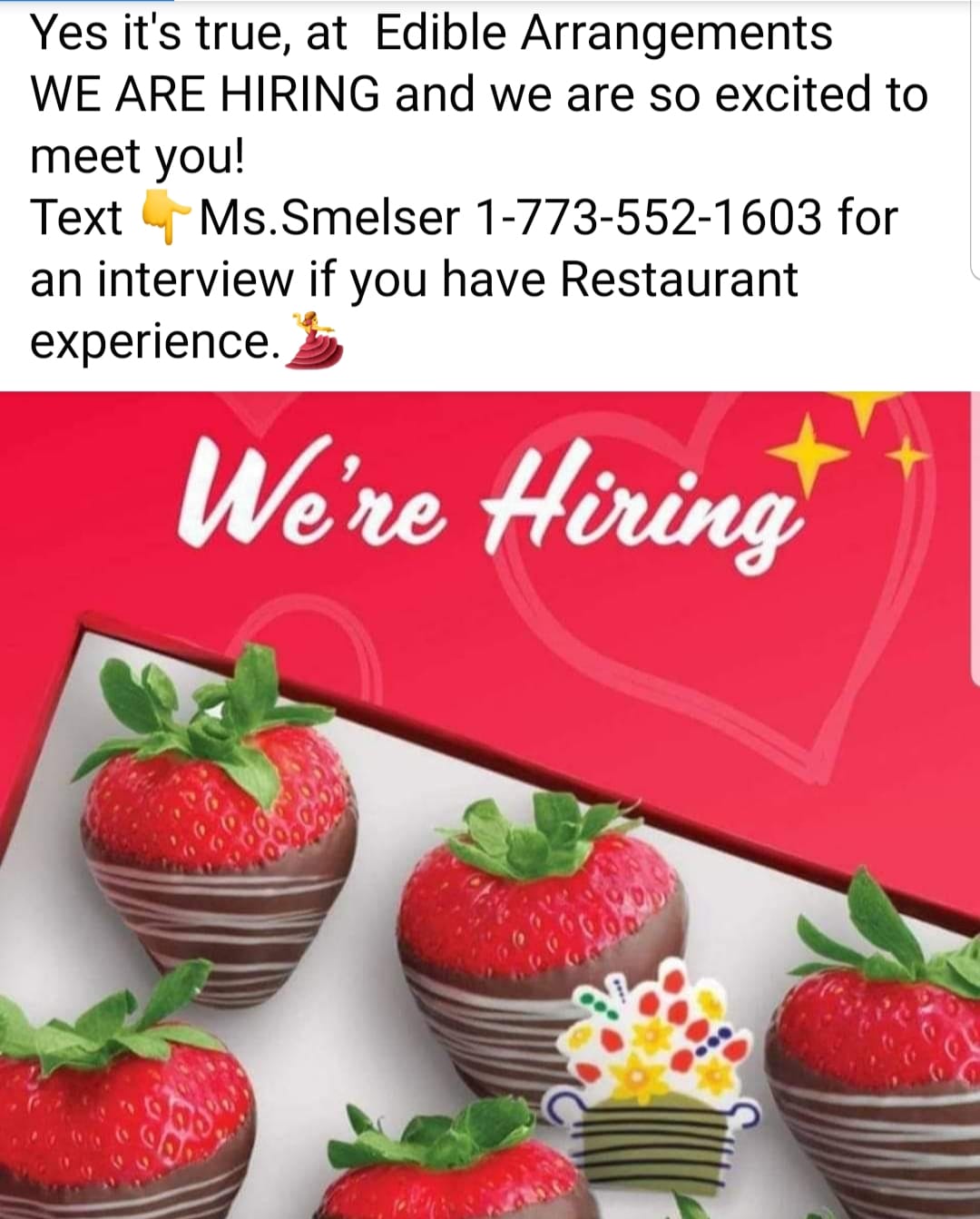 Unlike others, my experience with Edible Arrangement was pretty amazing. Sherrie, employee who delivered the arrangement, was fantastic in that she called me to let me know that no one was answering the door.