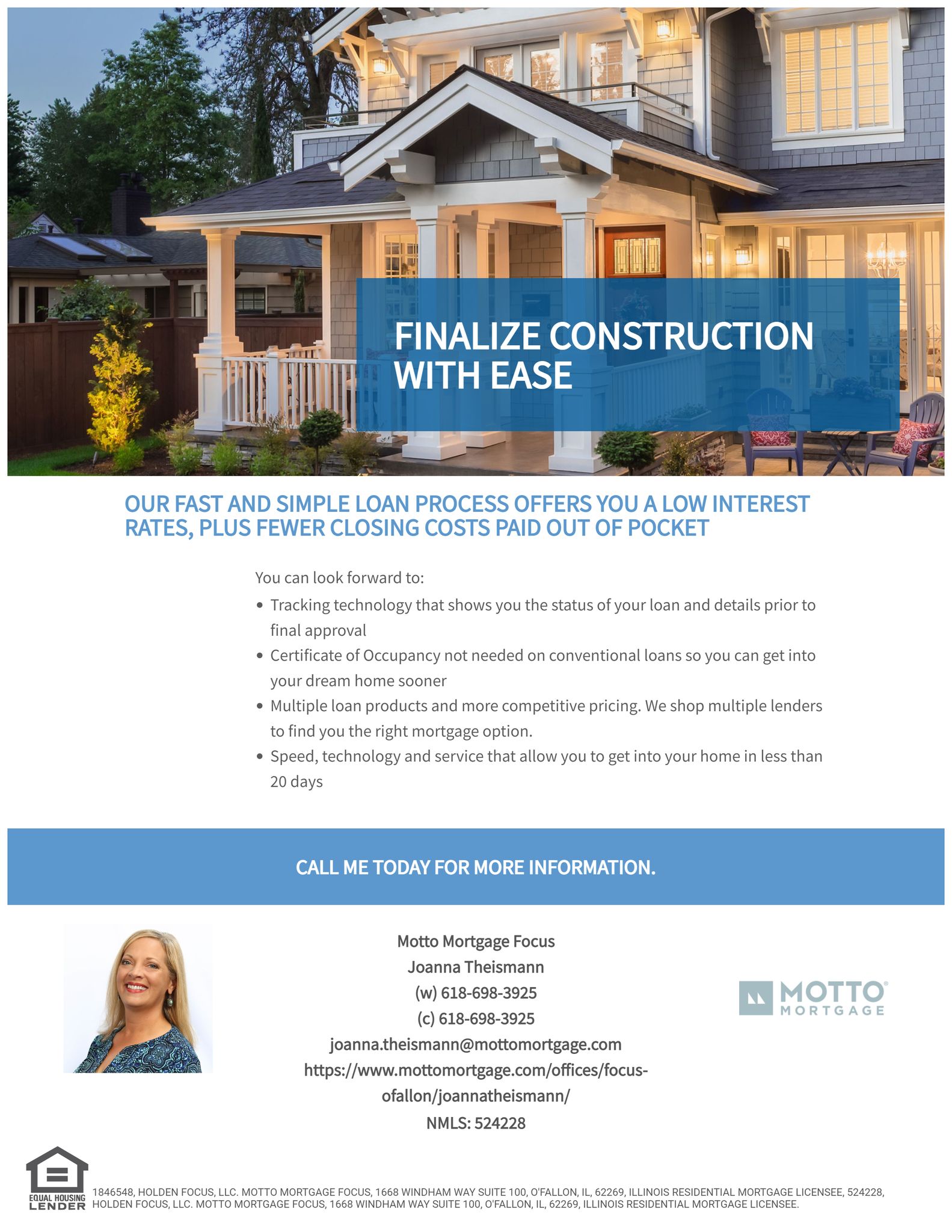 Welcome to Motto Mortgage Focus, your trusted mortgage brokerage in O'Fallon. We specialize in personalized home loan solutions and connect you with a wide network of wholesalers to ensure a transparent and efficient financing experience. Whether you're a first-time homebuyer or looking to refinance, our dedicated team will help tailor mortgage options to fit your unique needs. We will guide you every step of the way to ensure a smooth journey to homeownership.