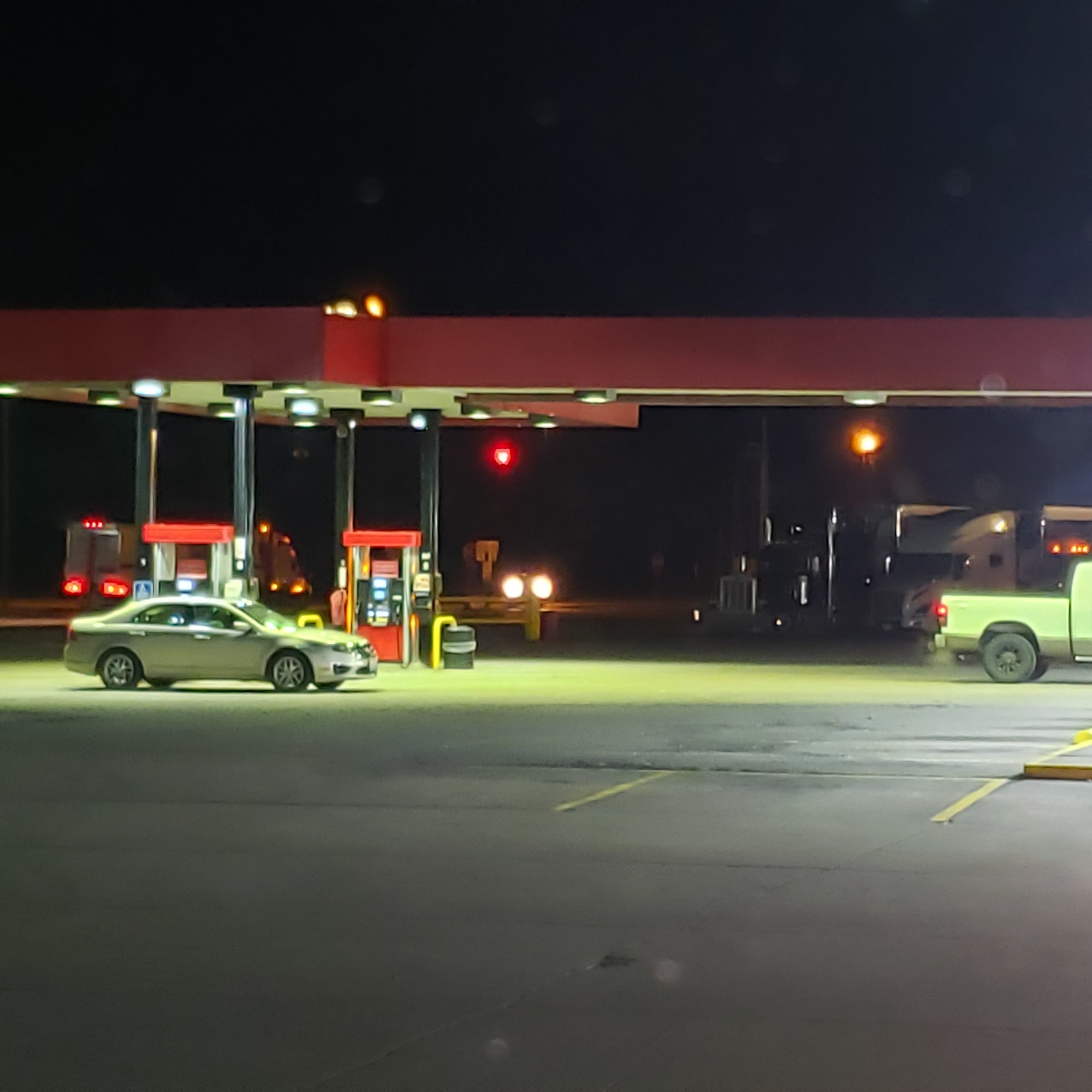 Red Rooster Terminal is a nice small, old-school truck stop with very friendly and attentive staff. It offers decent food selection, including good fried chicken and fresh, greatly priced meals like cinnamon rolls and real bacon. The place has pretty old but clean showers for a fee. Truck parking can be found here, even late at night, though spots are sometimes limited. Many find it a fantastic place and a better alternative to the business across the street.