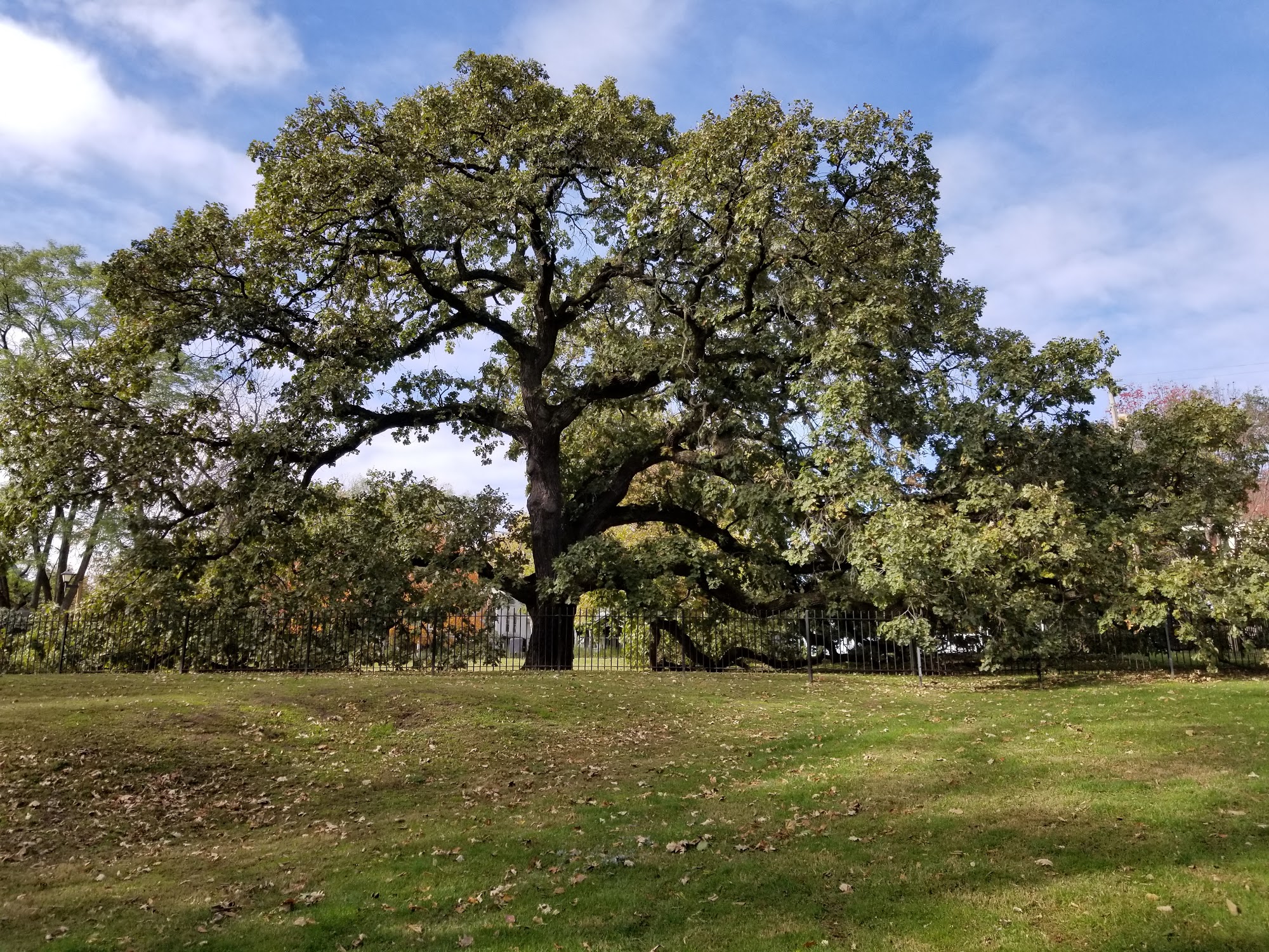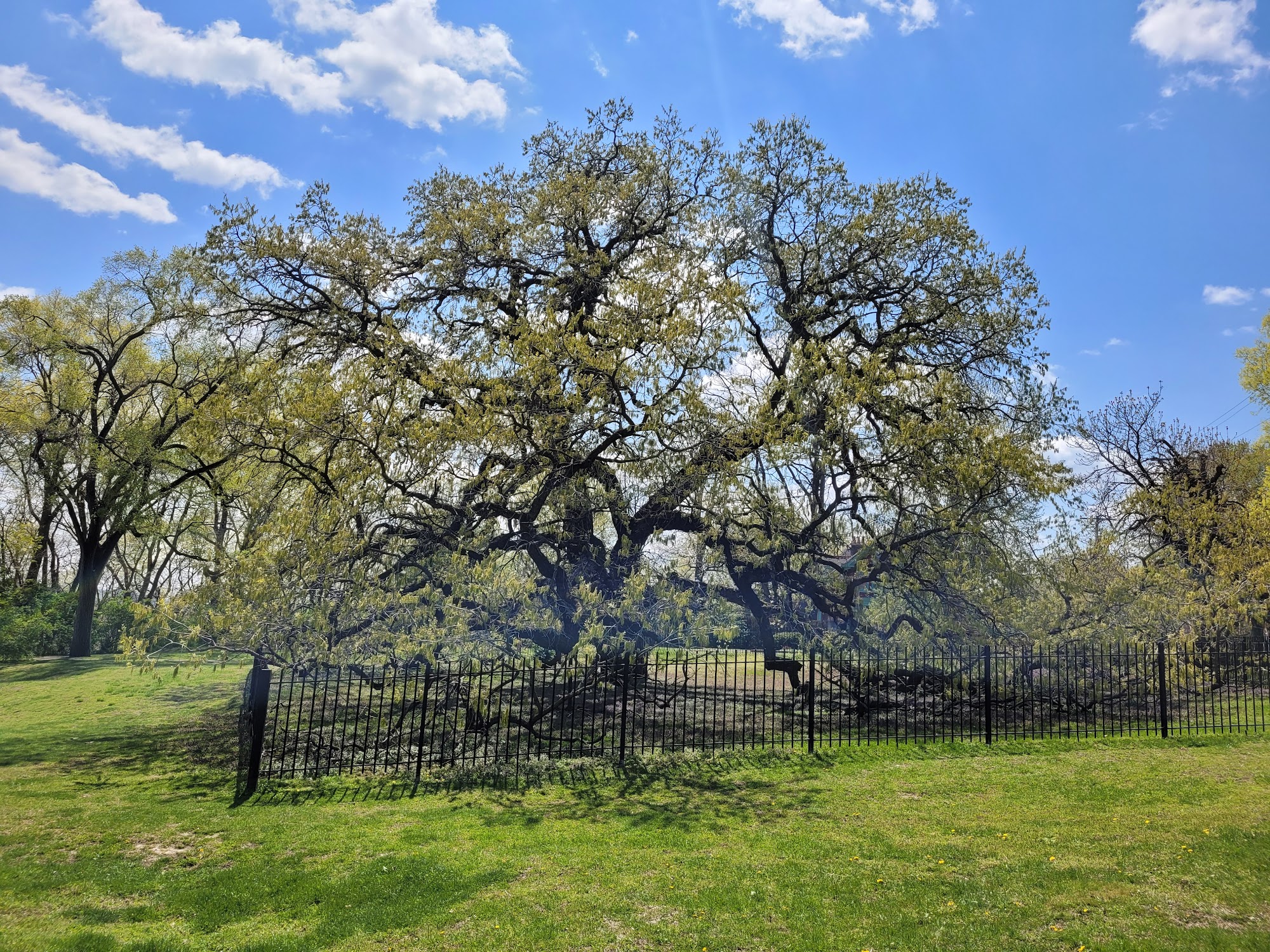 Giant Oak Park features an ancient Burr oak tree that is over 500 years old, dating back to the late 1400s. Visitors can enjoy the historical significance of the tree, although it is fenced off for protection. The park offers a picnic table and grassy areas for walking and reflection, making it a nice spot for those who appreciate history and nature. It is a breathtaking location worth a visit.