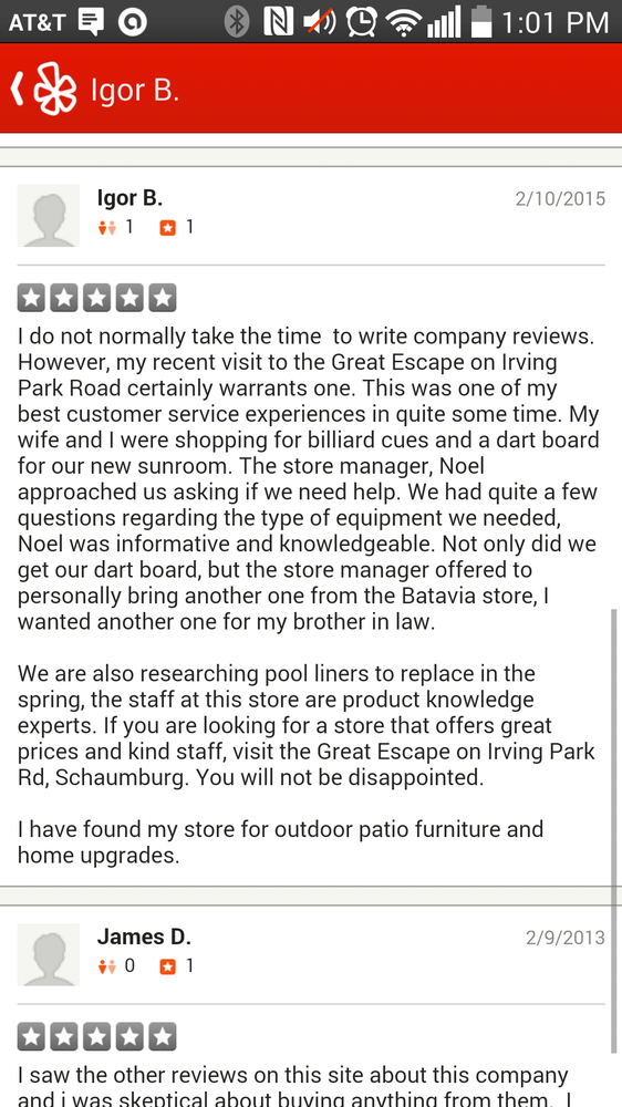 The Great Escape Schaumburg receives high praise for its knowledgeable and friendly staff who provide excellent customer service. Customers appreciate the staff’s patience, willingness to answer questions, and their ability to explain products clearly. For instance, Tim Fitzgerald is frequently mentioned as a fantastic and knowledgeable employee who goes above and beyond to assist customers, whether explaining how to operate a hot tub or resolving issues with pool installations. The staff’s dedication is evident as they often take extra steps, such as personally delivering items or resolving problems quickly, showing genuine care for customer satisfaction. Many customers return to this store for ongoing support, with staff members like Phil and Brian providing consistent assistance over the years. The store’s management, especially Tim, is praised for addressing problems promptly and making the experience stress-free, even when issues arise with deliveries or installation. Customers feel confident in the advice and support they receive, which helps them feel comfortable purchasing pools, hot tubs, and pool supplies. Overall, The Great Escape Schaumburg is known for its knowledgeable staff, outstanding customer service, and willingness to go the extra mile to ensure customer needs are met. This commitment to service makes it a trusted place for pool and hot tub purchases, as well as ongoing support for pool maintenance and repairs.