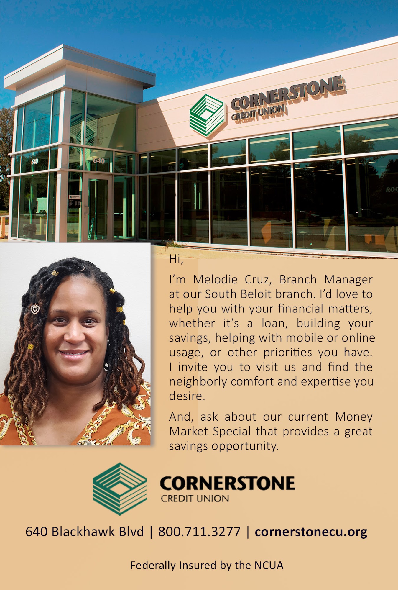 We love this credit union . They have best loan options when others have no options . I'm happy to call cornerstone our credit union!