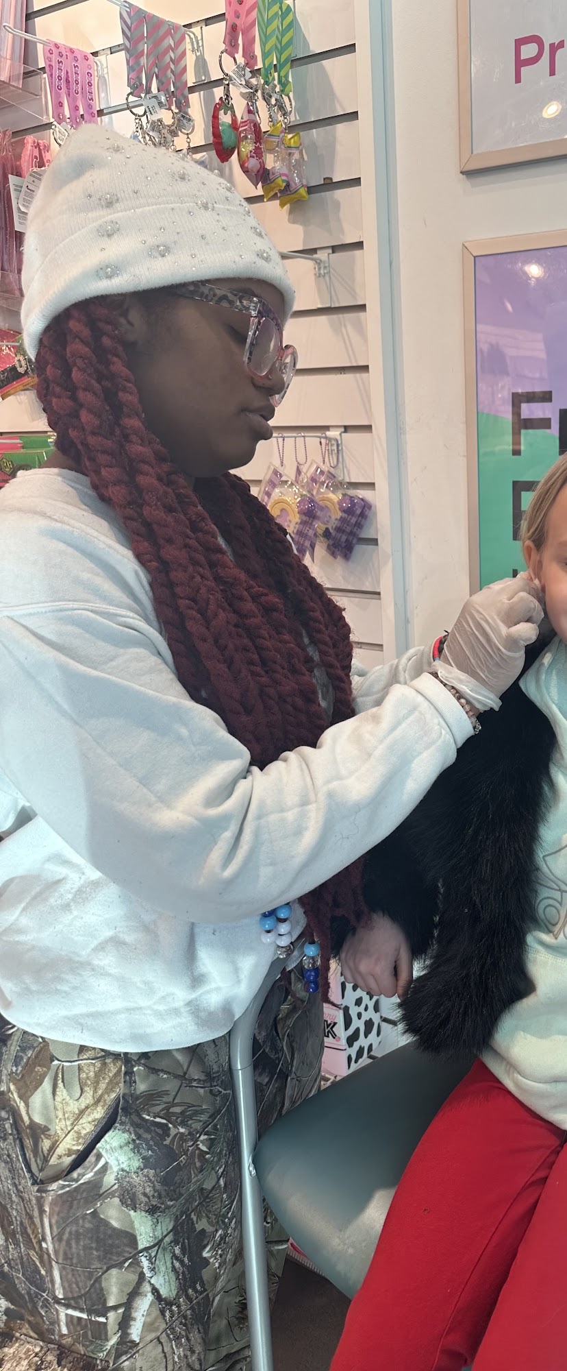 My daughter had her ears pierced today by this beautiful girl, and I cannot say enough good things about her! She talked and got to know my child and made this an all around awesome experience!! 10/10 recommend!