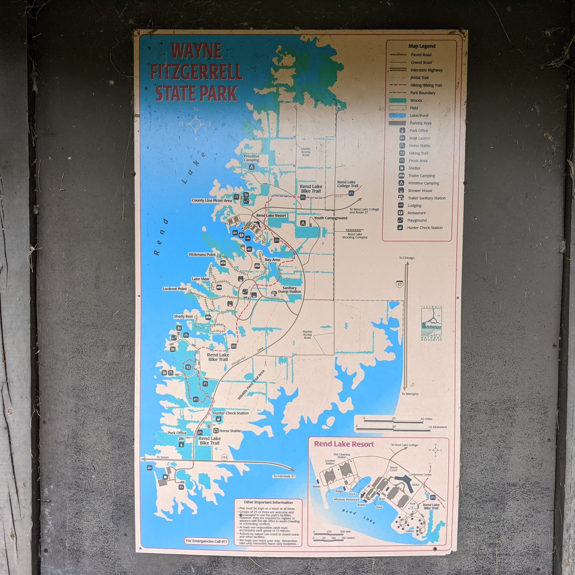 It is a beautiful park with Georgeous views of Rend Lake. The grounds are well maintained with smooth roads for walking or bike riding. Nice picnic areas with grills and pavilions and a playground are a great place to meet with family members and friends for lunch. There are vault toilets, very clean restrooms and showers, one shower does not work and another lacks hot water. Camping areas for RV camping are nice and there is a boat launch dedicated for campers. Dog-friendliness is leash law but still and love to run around. Fishing for catfish is good and boaters are nice. The area is clean and great for a day all around.