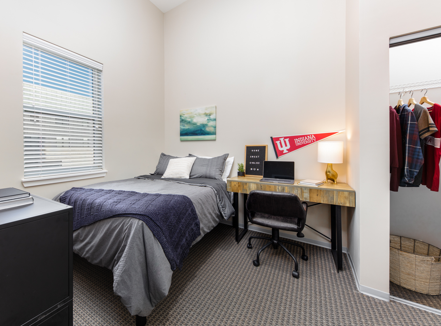 Evolve Bloomington is a student apartment community that offers a fresh, fun lifestyle close to Indiana University Bloomington. The property is described as safe, inviting, and with a convenient location steps from campus, including a nearby bus stop. Apartments range from studios to four bedrooms and feature private bathrooms, open-concept kitchens, modern furnishings, and newer appliances. The community provides many amenities on site, including a courtyard with a Jumbotron, a swimming pool, a sundeck, and a clubhouse with a game room. The staff is noted as extremely nice, helpful, and going above and beyond for residents. Overall, Evolve Bloomington is recommended as more than just an apartment, but as a welcoming community for student living.