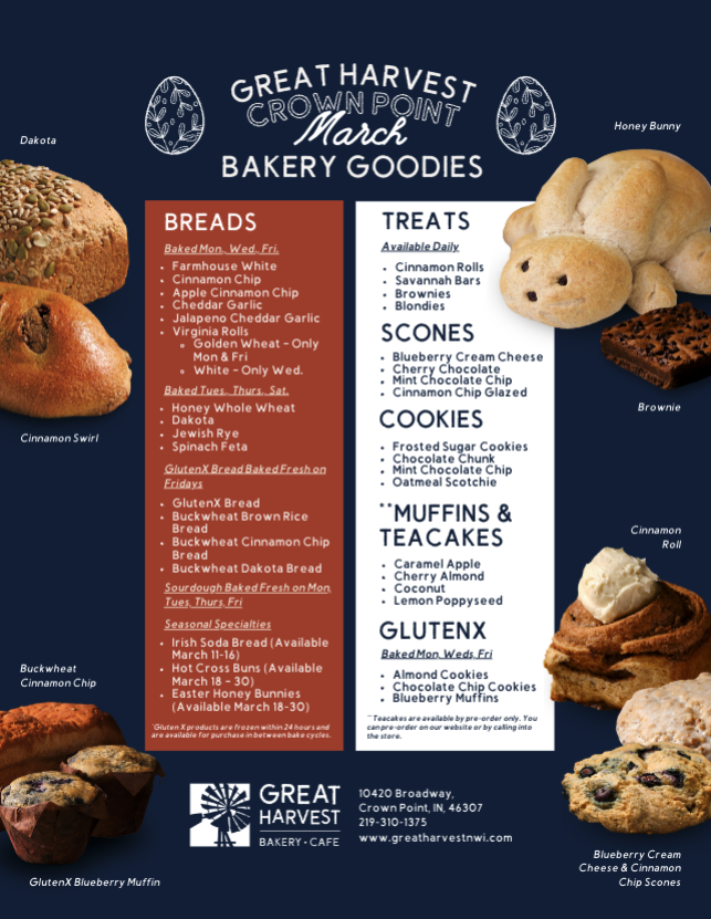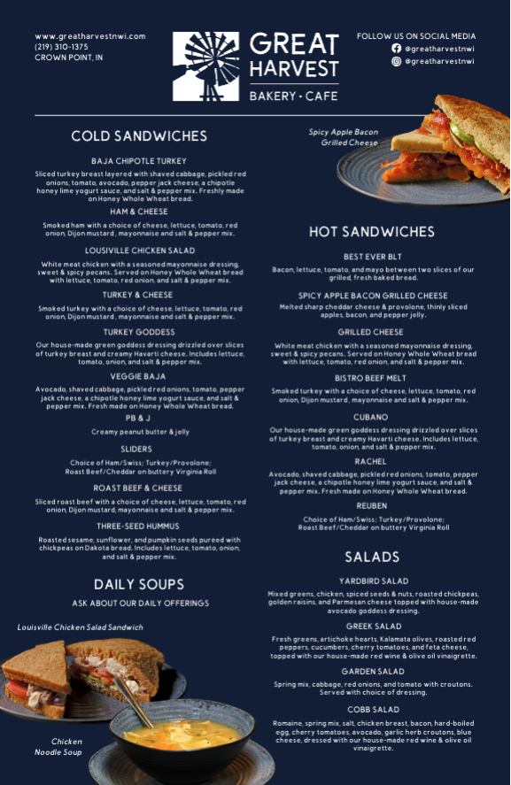 Great Harvest Bakery/Cafe is an amazing addition to Crown Point. It is a clean, new building with a friendly and super nice staff. The bakery quality is top notch, serving fresh, delicious, and wholesome breads and goodies made from scratch daily. Their baked bread is the best ever, featuring specials and seasonal breads you must try. The cinnamon rolls are second to no one. They offer a wide variety of artisan breads, sweets, and rather large, full-of-flavor made-to-order sandwiches, though one specific sandwich was just ok for a first-time customer. The Cobb Salad is loved, and the Cinnamon Chip Bread is awesome. It is a great place for a quick breakfast or lunch, with a warm smile and exceptional service. Everyone should come try this place.