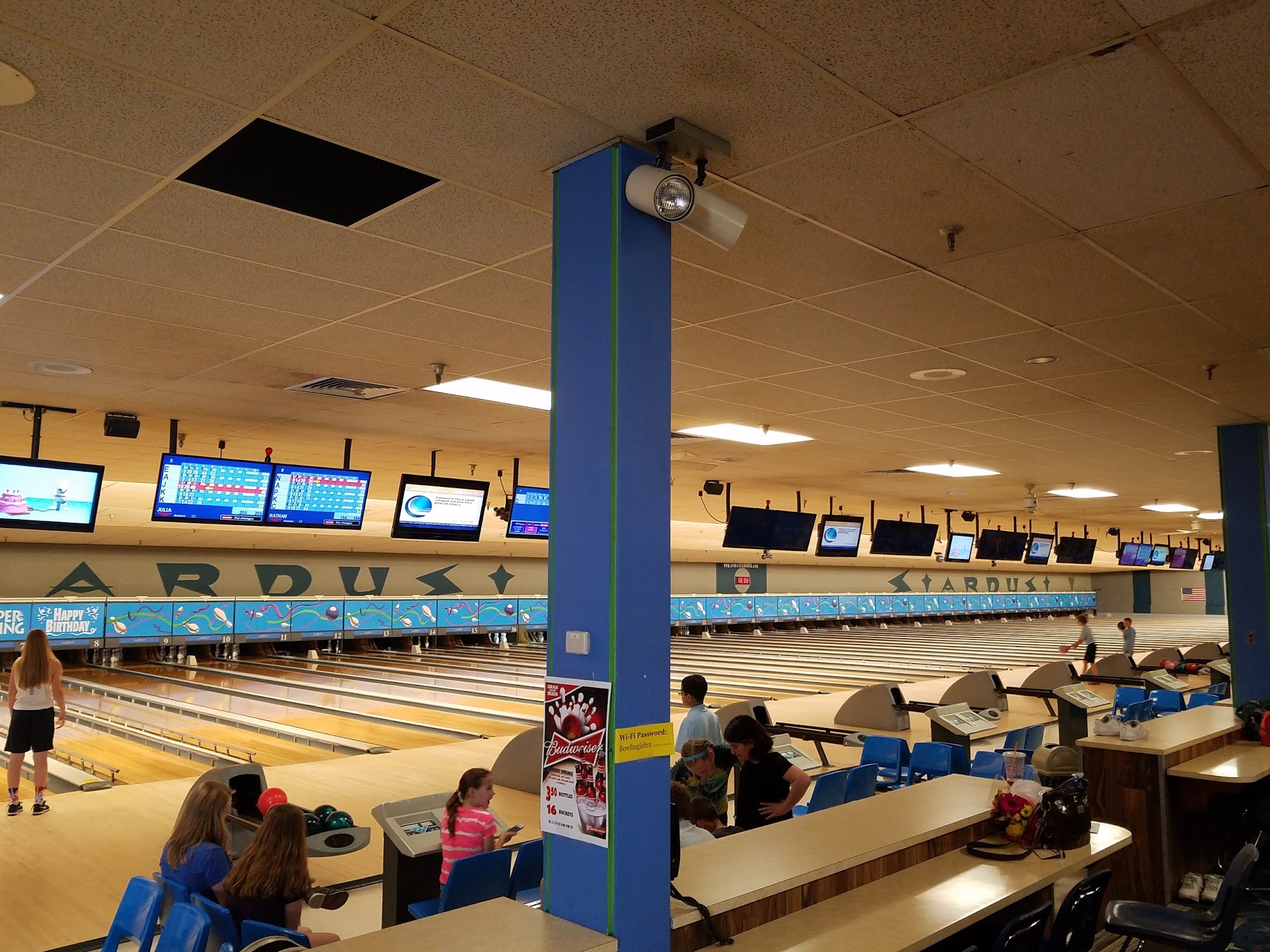 Stardust Bowl 3 is an old-school, local, and comfy bowling alley. It is not a fancy place, with old wooden lanes in good condition, and the bowling itself is pretty average. However, the kitchen is a golden gem, serving the best pizza and wings in town and arguably in the state. The food is amazingly good, affordable, and delicious, with a full bar offering good drinks. The staff is very friendly and helpful. It is a great, safe, and clean place for family fun, birthdays, and events, featuring party rooms, a huge game room, and lots of laughter.