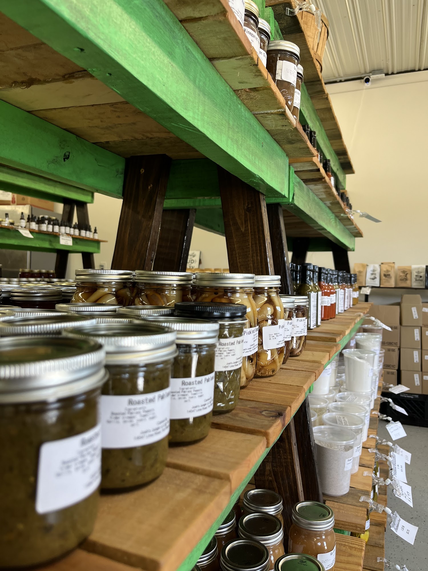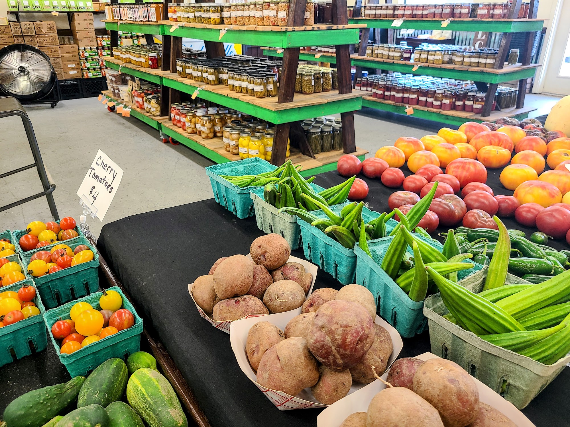 Fresh produce in the summer, home made jams, jelly, sauces and pickled items. Works with the community to bring fresh items