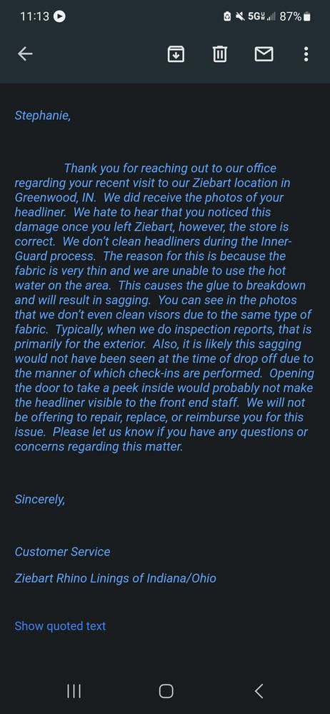 The Greenwood Ziebart is excellent either way it’s protection offerings, customer service, and the employees who detail the car do an AMAZING job. I highly recommend Jacob and Aaron. I LOVE the Z gloss Ceramic Shield and window tinting I chose. Thank you all for a pleasant transaction.