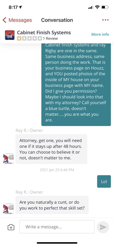 After 3 years of using and treating our cabinets normally, they still look the same as they did on day one after Ray and his son-in-law completed painting. Absolutely cannot see any difference in the finish from those new cabinets sold in high end stores. Very pleased with job and price.