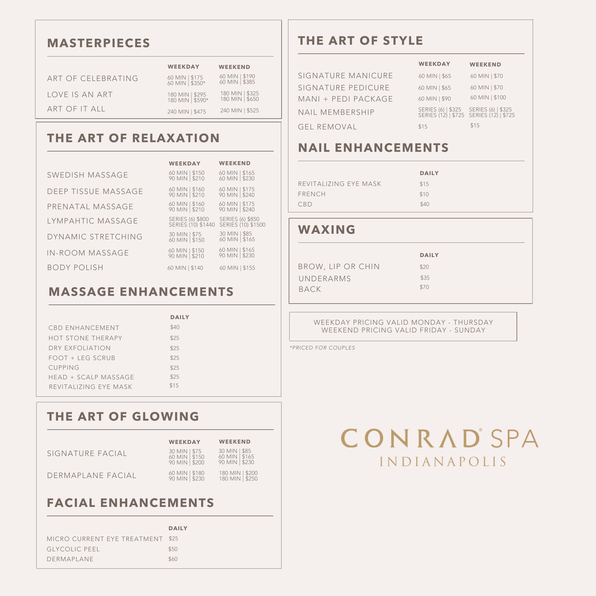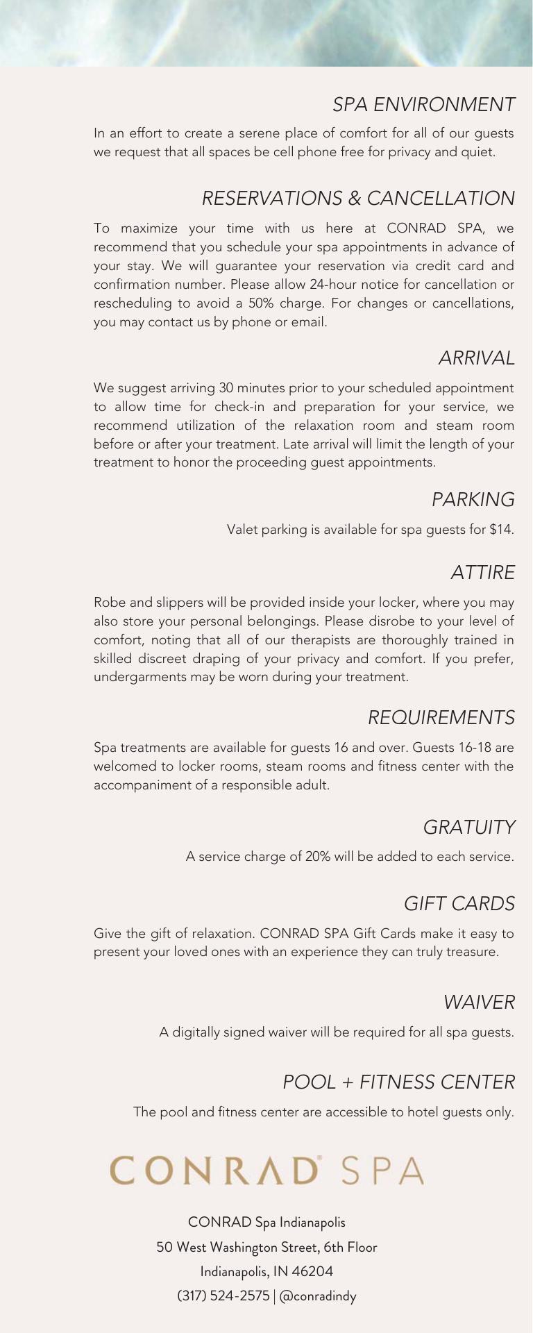 Conrad Spa Indianapolis offers a luxurious urban oasis where relaxation is an art form. Guests can expect curated treatments that leave them looking and feeling their best. The spa's wonderful staff, including Lee, Roxanne, Leah, Danielle, and Tina, provide exceptional service. The hotel itself is described as the nicest in Indiana, with a gorgeous interior, spotless cleanliness, and friendly, helpful staff. Visitors can also enjoy the infinity pool, hot tub, and on-site restaurant, Capital Grille, for a perfect date night or night out with friends. The spa is highly recommended, with guests raving about the amazing 90-minute massages provided by Francesca and April.