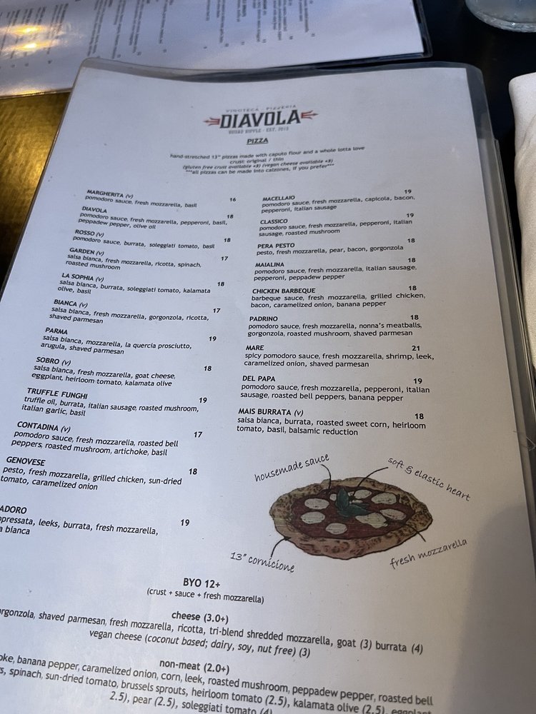 Diavola is a popular pizza and Italian food restaurant known for its great service and homemade, delicious meals. The pizza is outstanding, featuring a light and fluffy crust. Other menu highlights include the flavorful Wild Mushroom ravioli and the pizza called Mais Burrata. The restaurant is busy, with many carryouts, and offers outside seating. While table arrangements can be a bit cramped, friendly servers like Madeline and Sean provide attentive and accommodating service. Customers have praised the overall experience, noting that everything from appetizers to desserts, such as tiramisu and spumoni bomba, is amazing. The food is consistently delicious, made with quality ingredients and full of authentic flavors. The restaurant is often packed, especially on busy nights when there are special offers like half-off bottles of wine, but guests are seated quickly and enjoy good service. Although the small space can lead to a high noise level, many find this a wonderful place for top-notch food and friendly service. Visitors often leave happy, talking about how much they enjoyed the pizza and the warm, welcoming atmosphere.